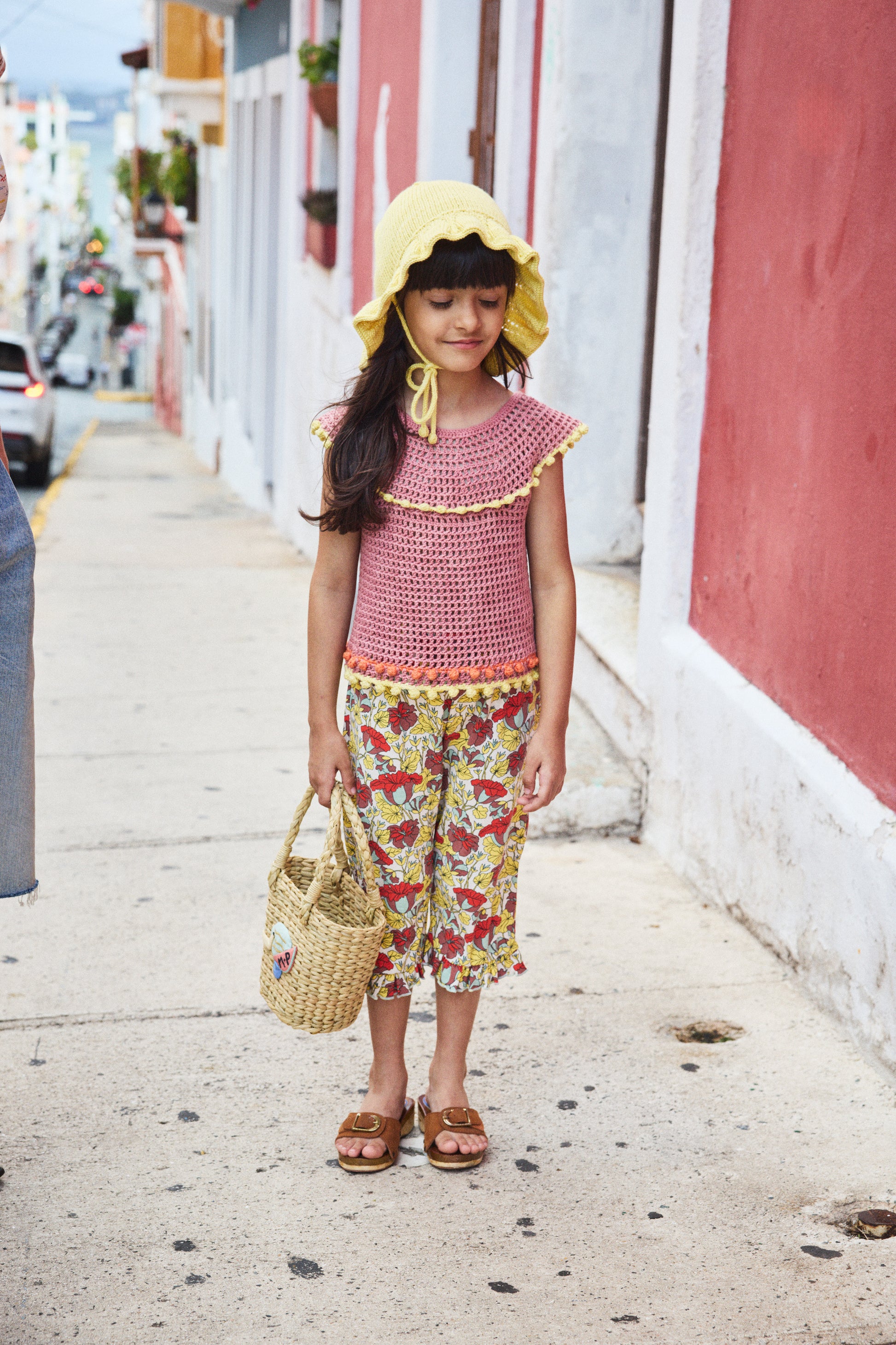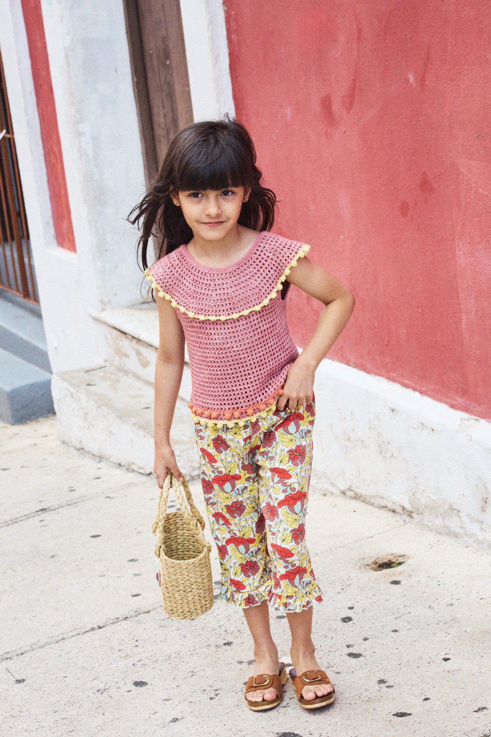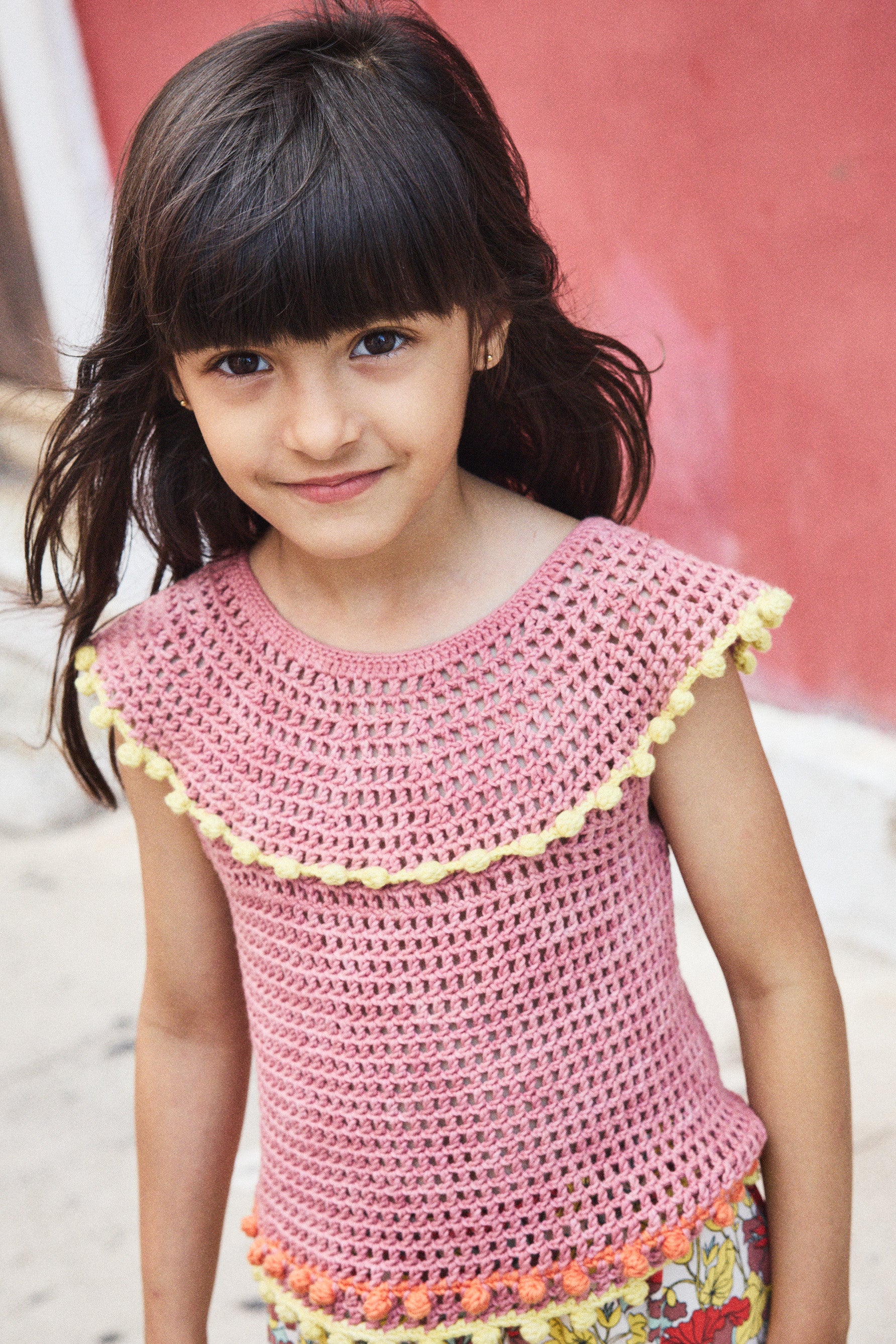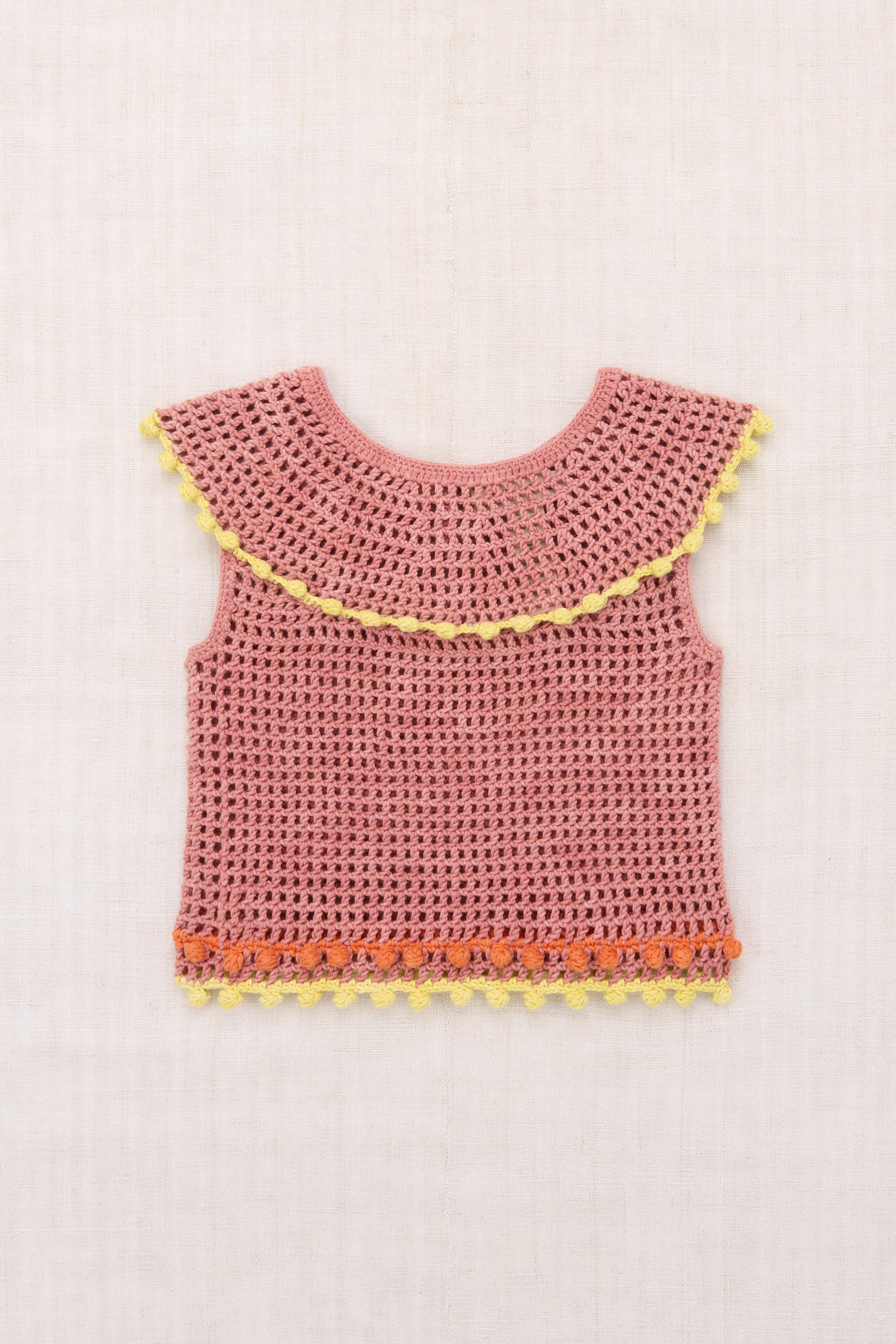 A hand-crocheted sleeveless top in a Pima cotton knit, featuring a crescent yolk with contrast popcorn trim. The open crochet work gives this style a soft, airy feel. Finished with a double-placed popcorn hem.