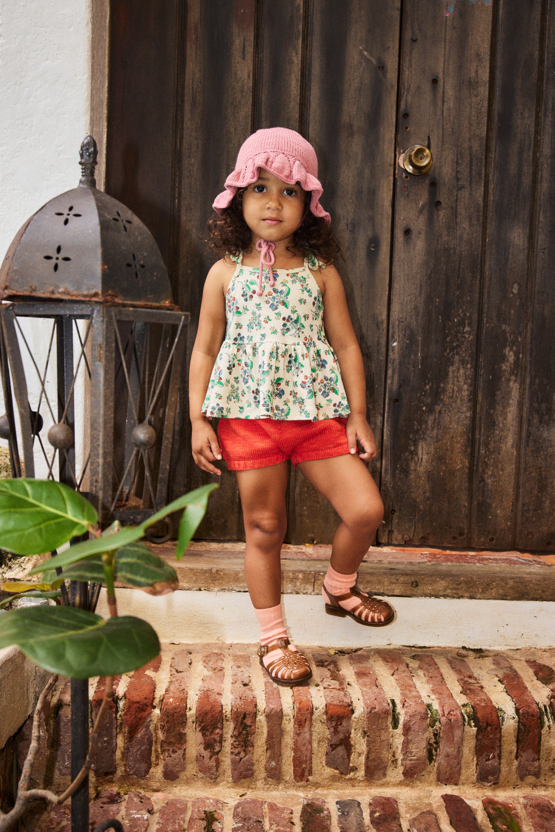 A hand-knit hat in Pima cotton, featuring a brim with eyelet stitch detail and popcorn tie closure at the chin.