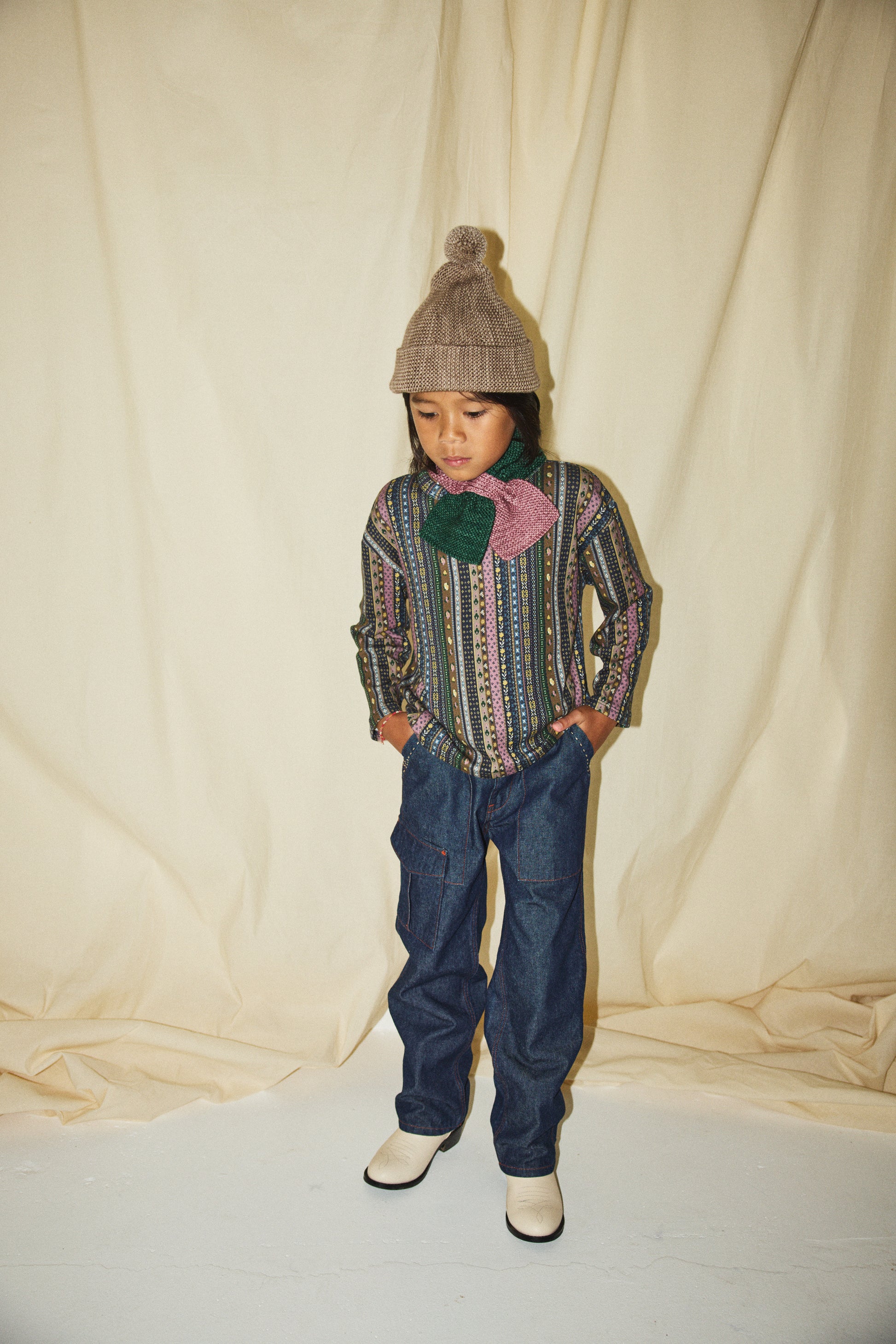 Our denim is 100% cotton, with thoughtful touches like contrast topstitching, hand-tacked embroidery instead of rivets for softness, and adjustable waistbands and straps for long wear and the perfect fit. Our denim has no stretch — yet has a naturally soft hand-feel and is effortlessly versatile.