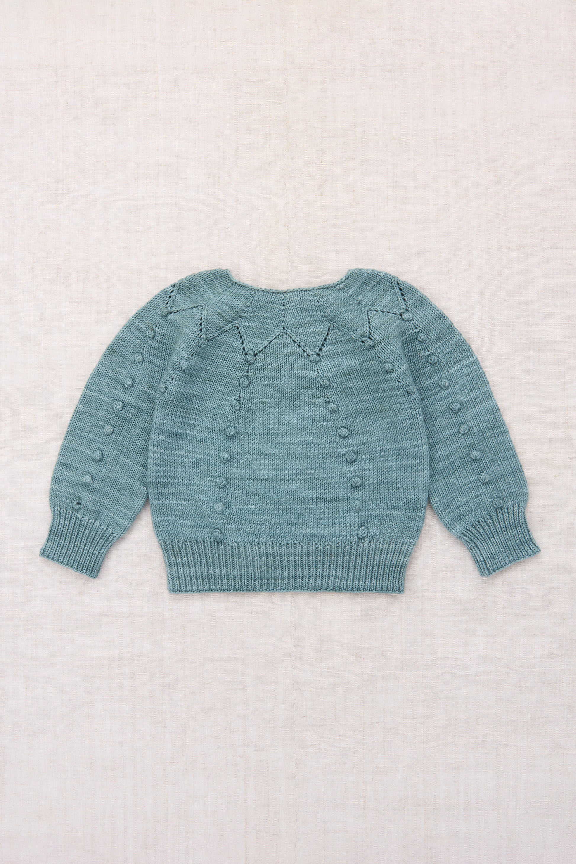 A hand-knit sweater in Merino wool, featuring popcorn stitch rows, eyelet detailing at the neckline, a pointed zigzag motif at the collar, and a horn button closure at the back neck. A linear reinterpretation of Misha & Puff’s signature Popcorn Sweater, this style first appeared in our debut collaboration with Apolina — and we’re thrilled to bring it back.