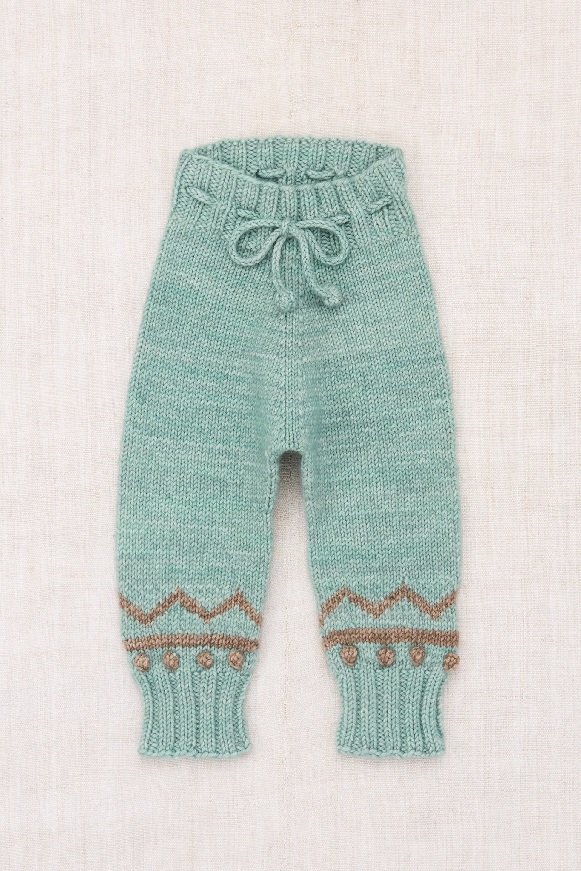 A cozy hand-knit jogger-style legging in Merino wool, featuring hand-worked popcorn stitch details, a zig zag motif, a ribbed waistband with a popcorn-tie drawstring for a secure fit, and ribbed cuffs.