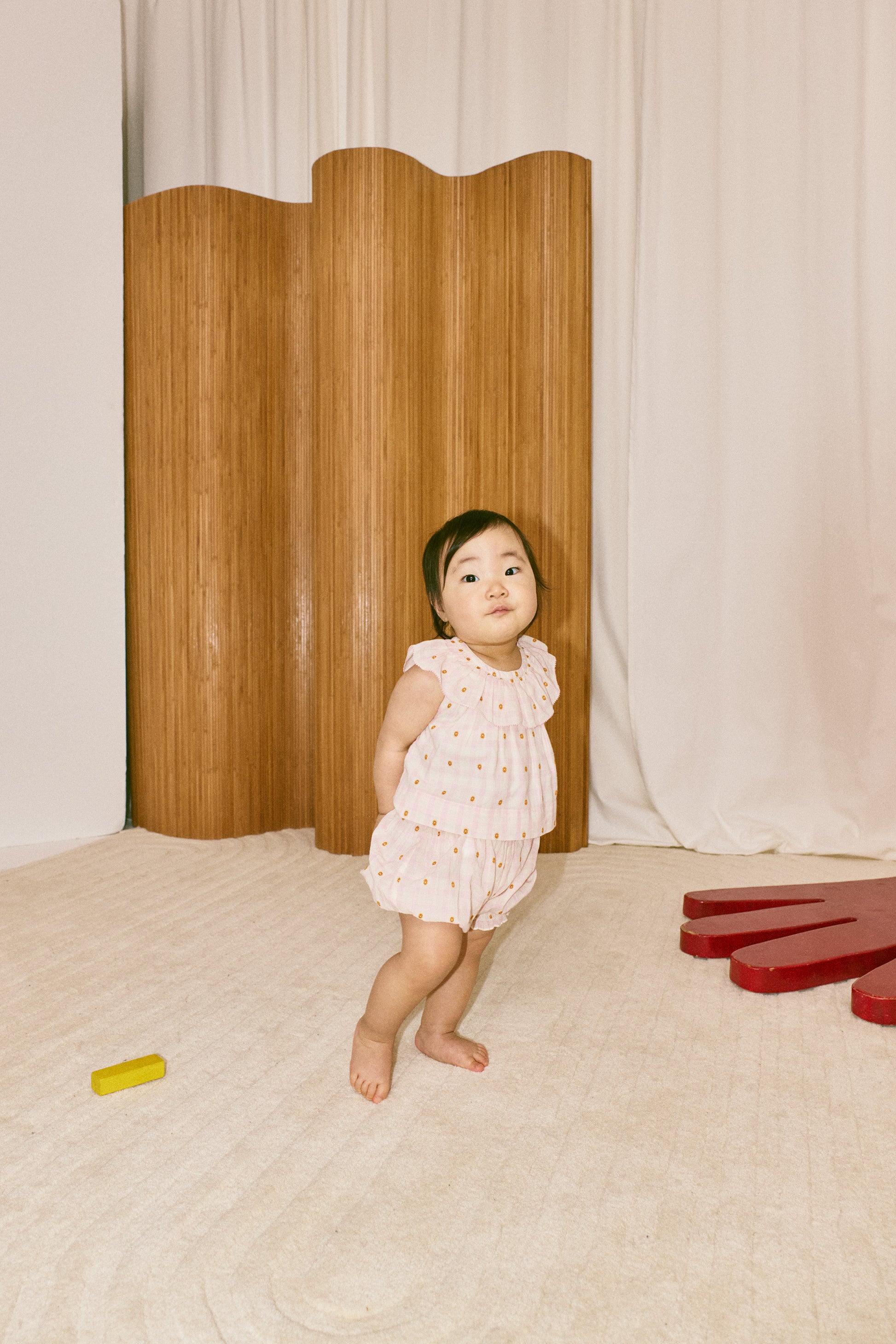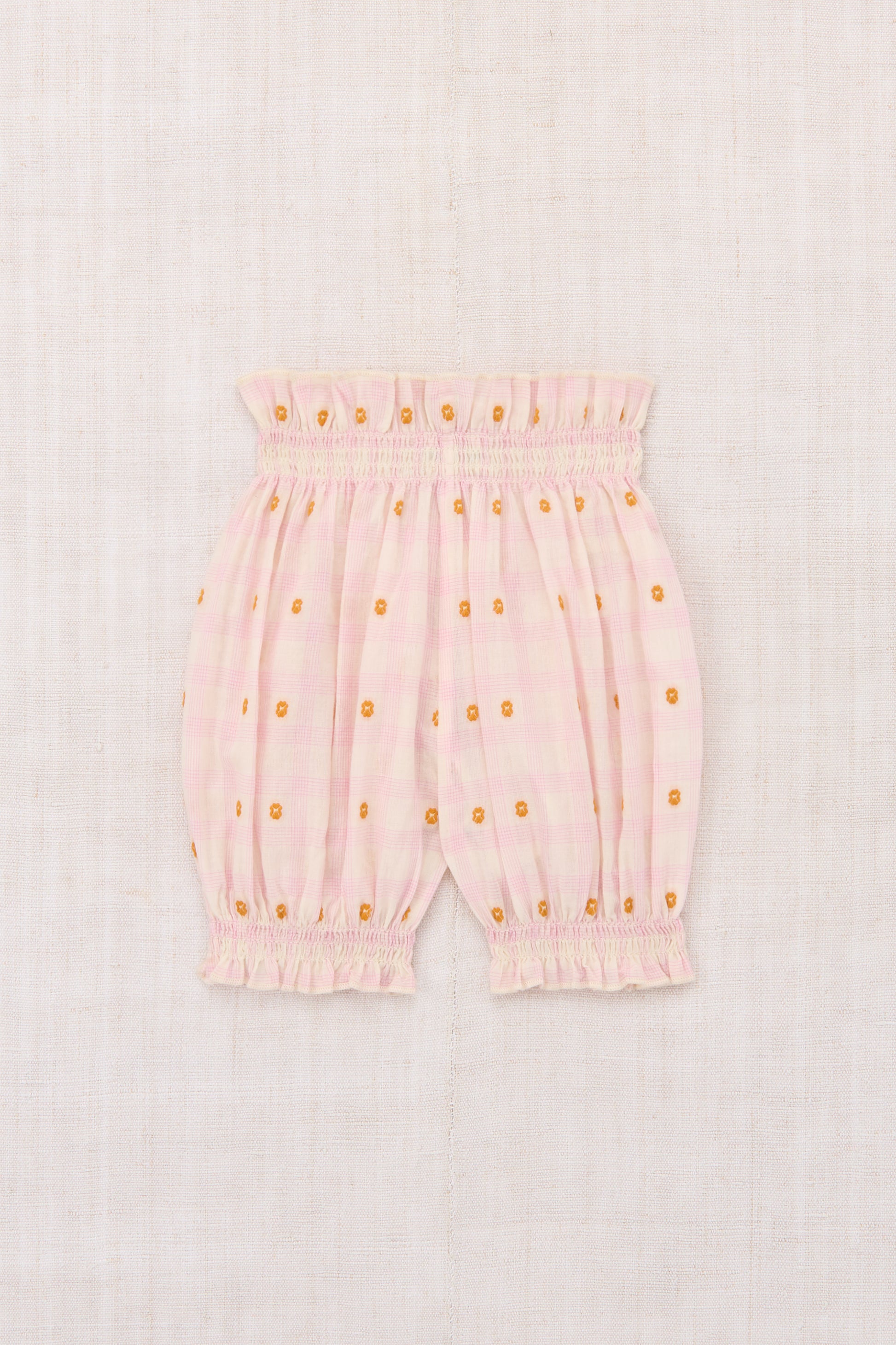 A pull-on bloomer in lightweight organic cotton plaid, with a woven textured design, and a cinched ruffle elastic waist and leg cuffs with merrowed edges. Fully lined in cotton voile and finished with French seams.