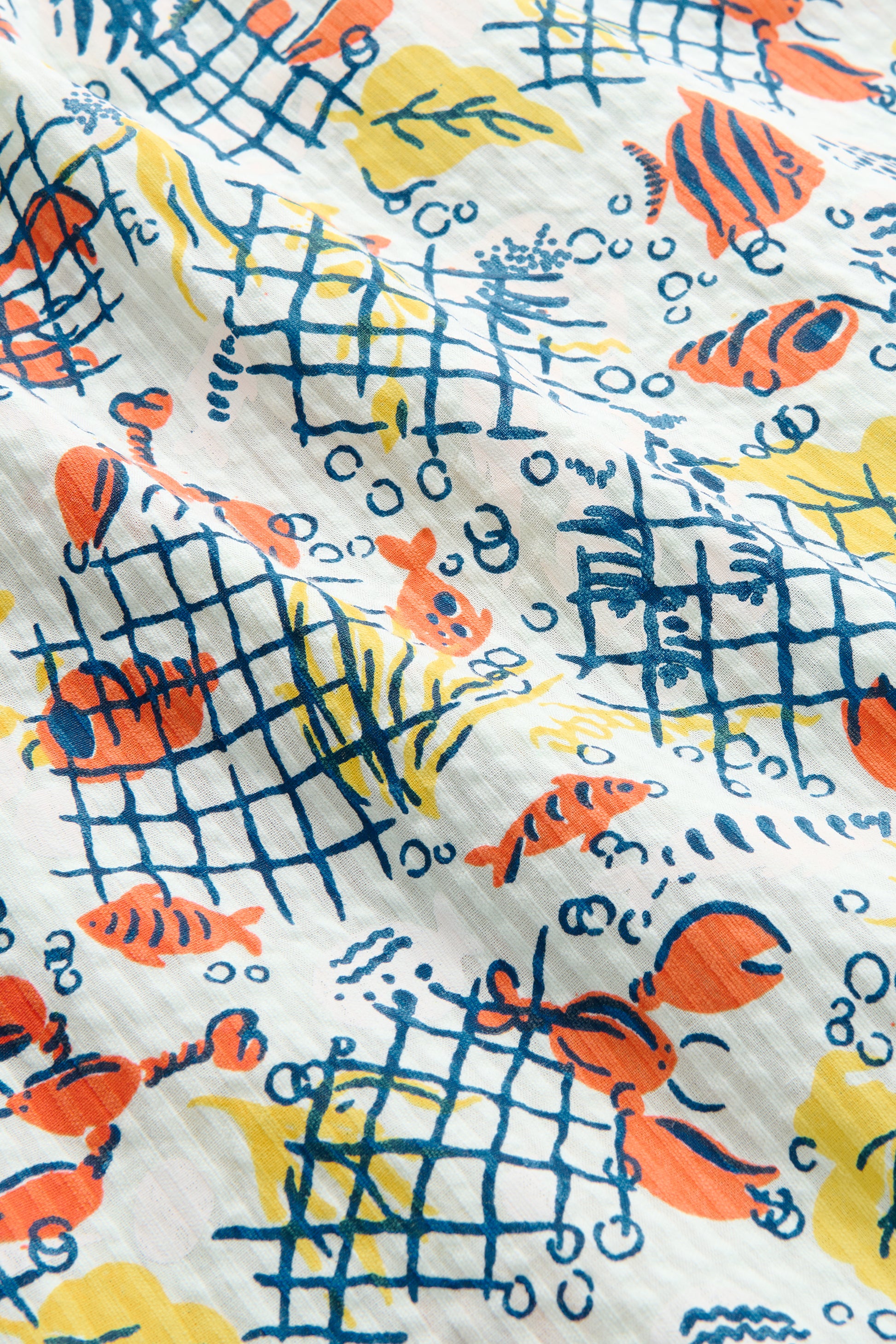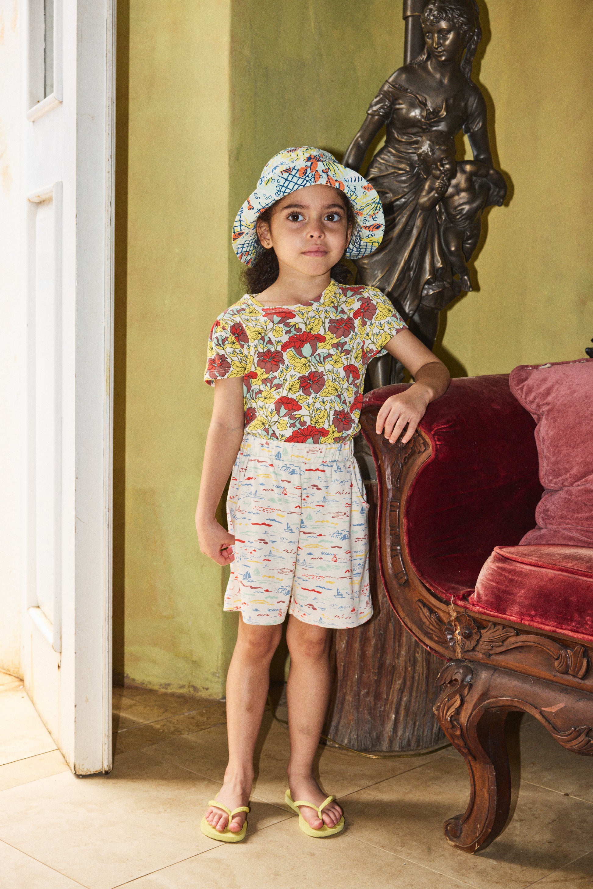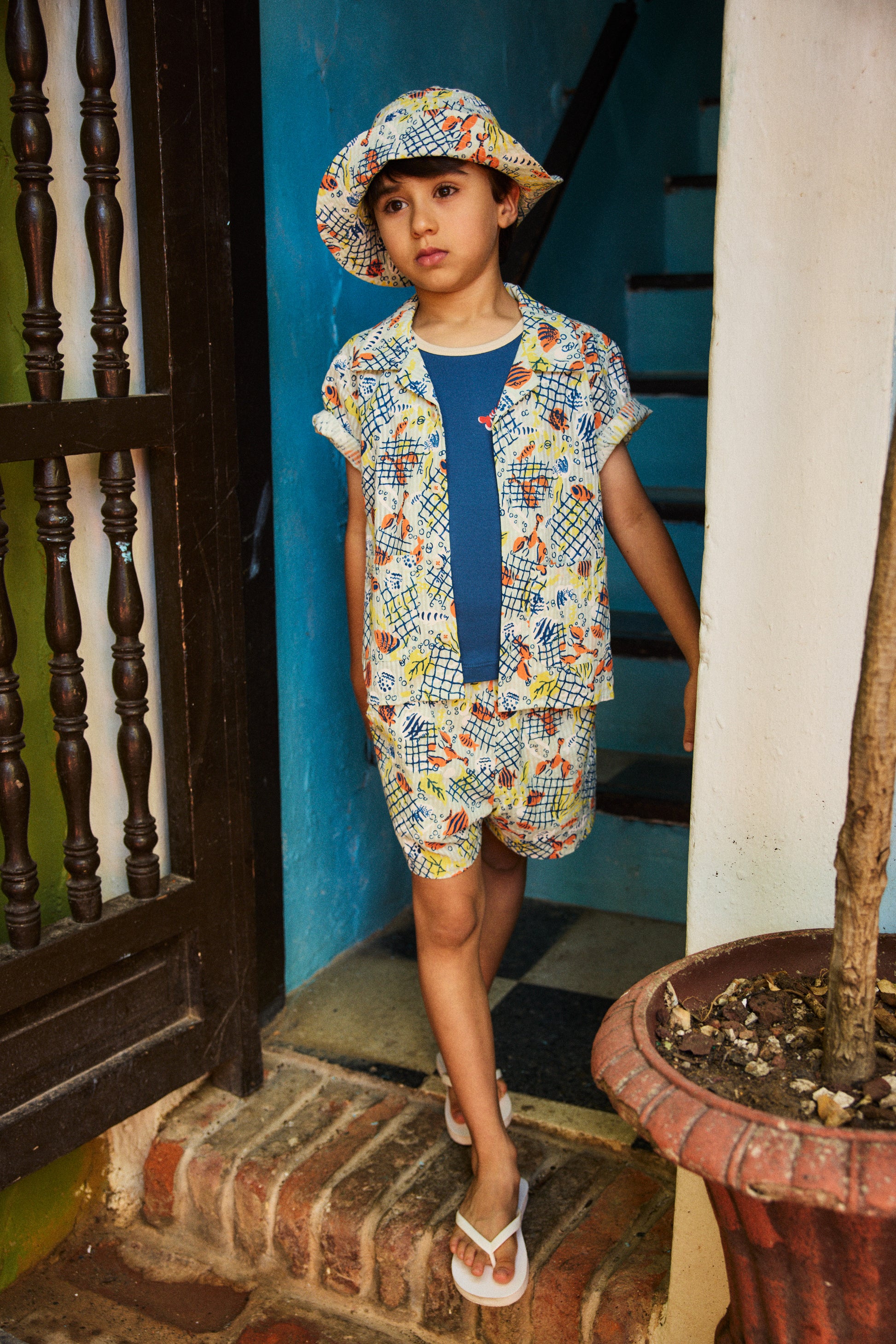 A classic bucket hat in organic cotton seersucker. Featuring a print inspired by New England and a pair of found vintage swimmers from the '40s. A go-to favorite.