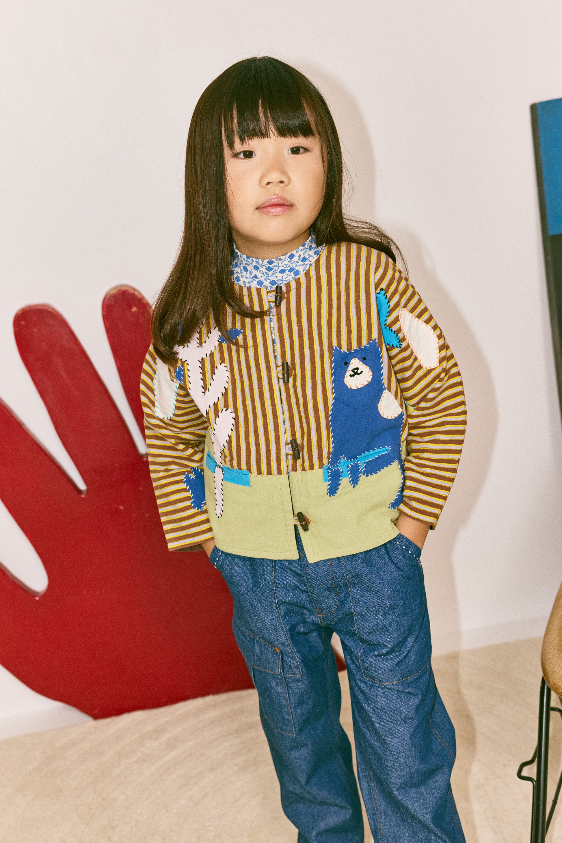 A fully lined graphic jacket in organic cotton crimp poplin, featuring hand-sewn appliqué motifs, welt pockets, wooden toggle closure, and a lived-in vintage feel.