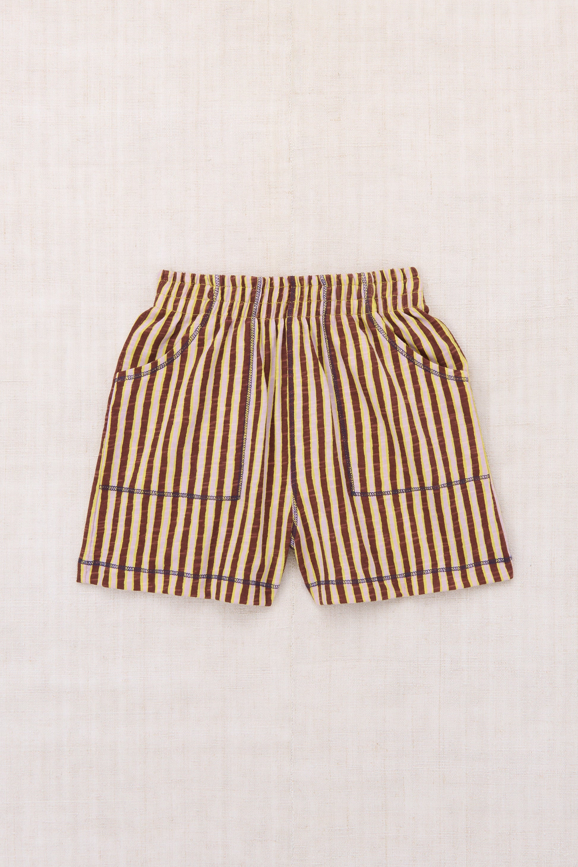 A pull-on short in organic cotton slub jersey, featuring a gathered elastic waistband, two patch pockets, and sporty contrast stitching. This slub jersey is slightly thicker than our Pima cotton styles, with a touch of structure.