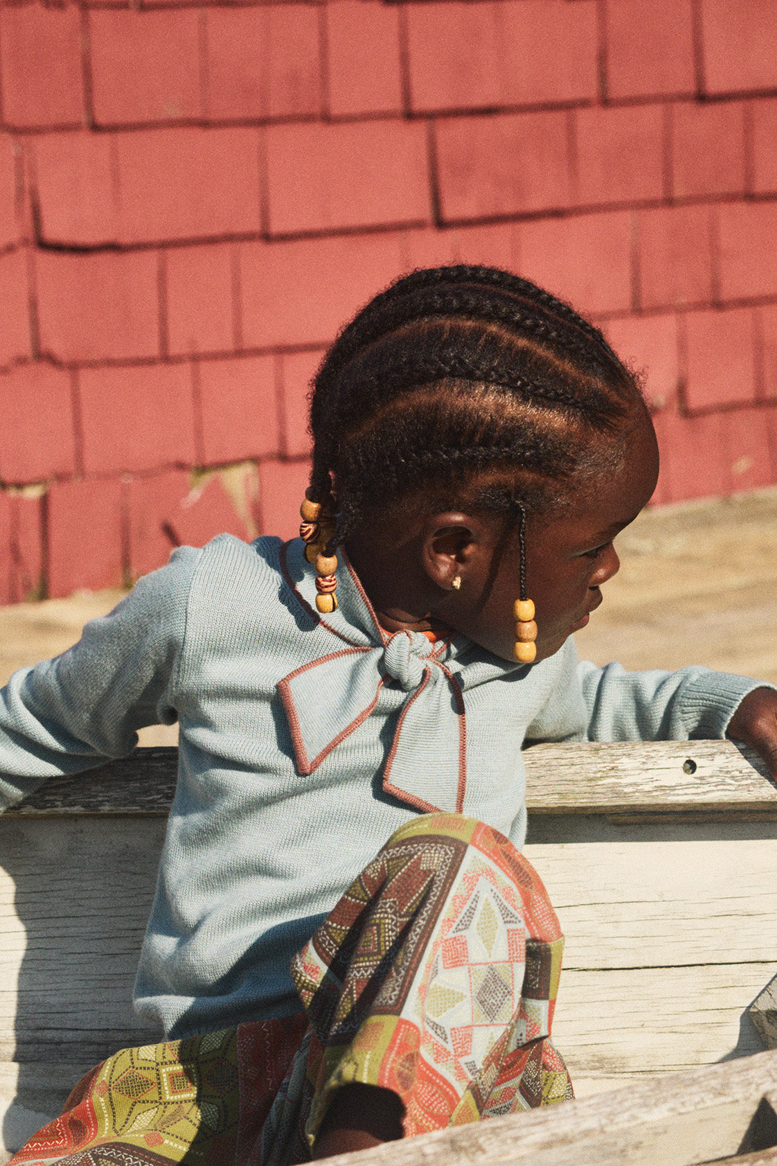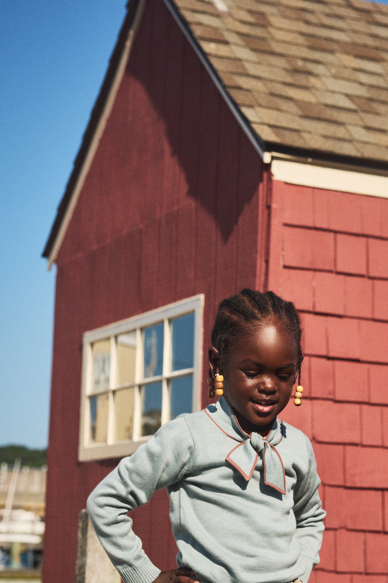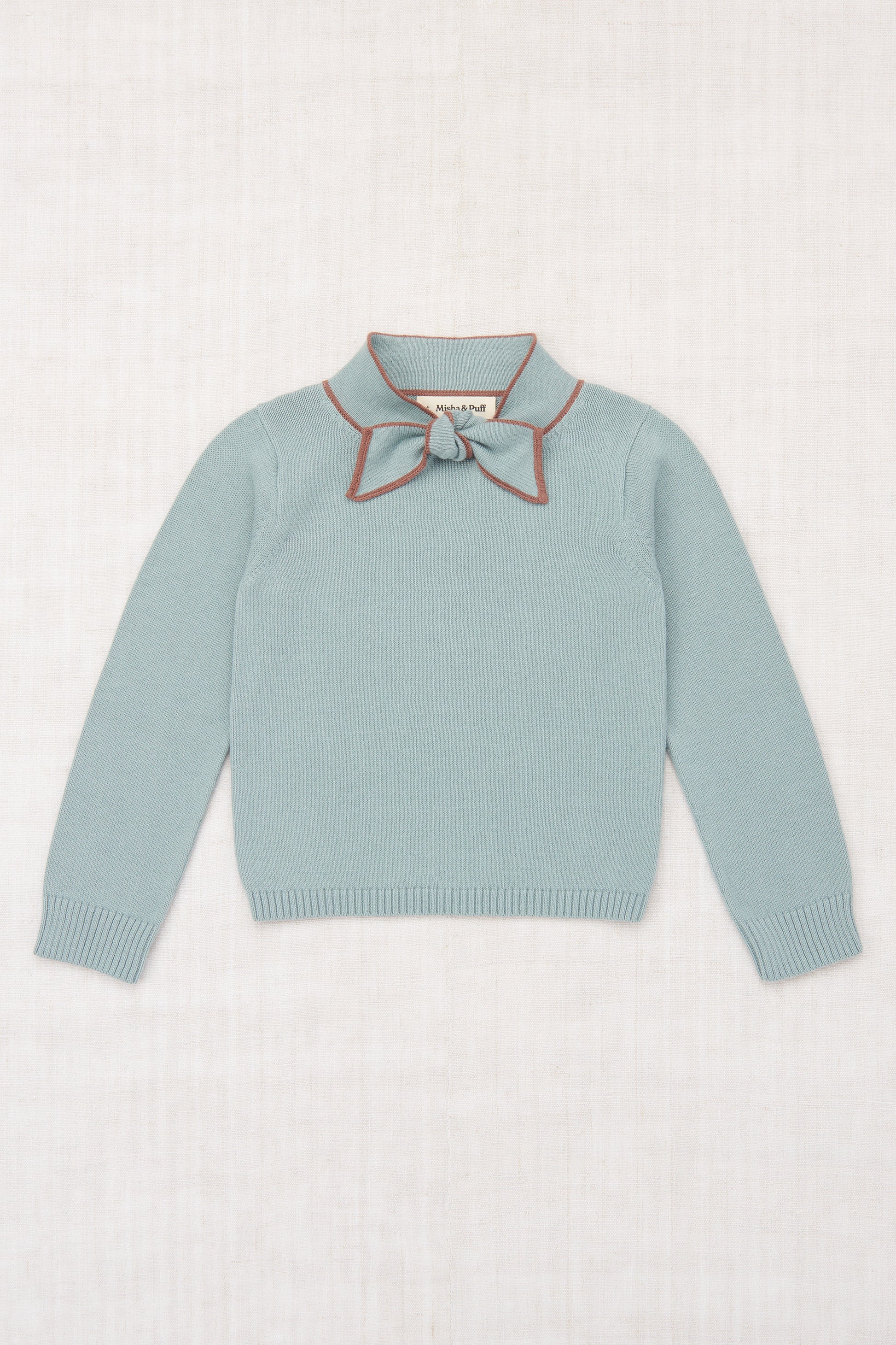 A pullover sweater in a fine-gauge Pima cotton knit, featuring a mock neck, tied bow at the front with contrast trim, and ribbed cuffs and hem. Easy to layer for chilly and warm months alike.