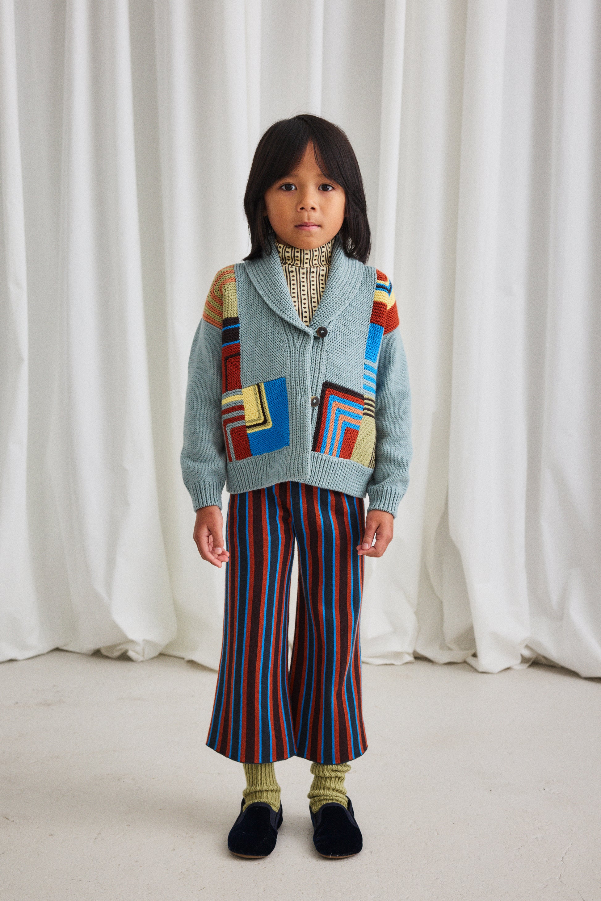 A patchwork cardigan in Merino wool, featuring hand-knit multi-color mitered squares designs, a shawl collar, ribbed cuffs and hem, and a horn button closure.