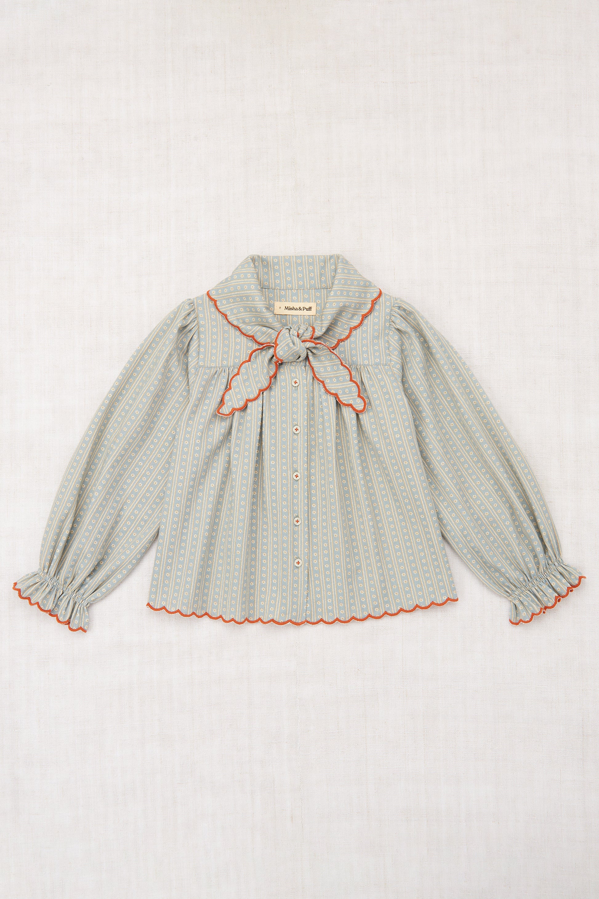 A long-sleeved top in cotton twill, inspired by our signature Scout Top. Featuring a gathered yoke, tie-collar kerchief secured at the neck, blouson sleeves with soft elastic ruffled cuffs, and all-over scalloped detailing with a contrast merrowed edge. Finished with corozo button closure and French seams.
