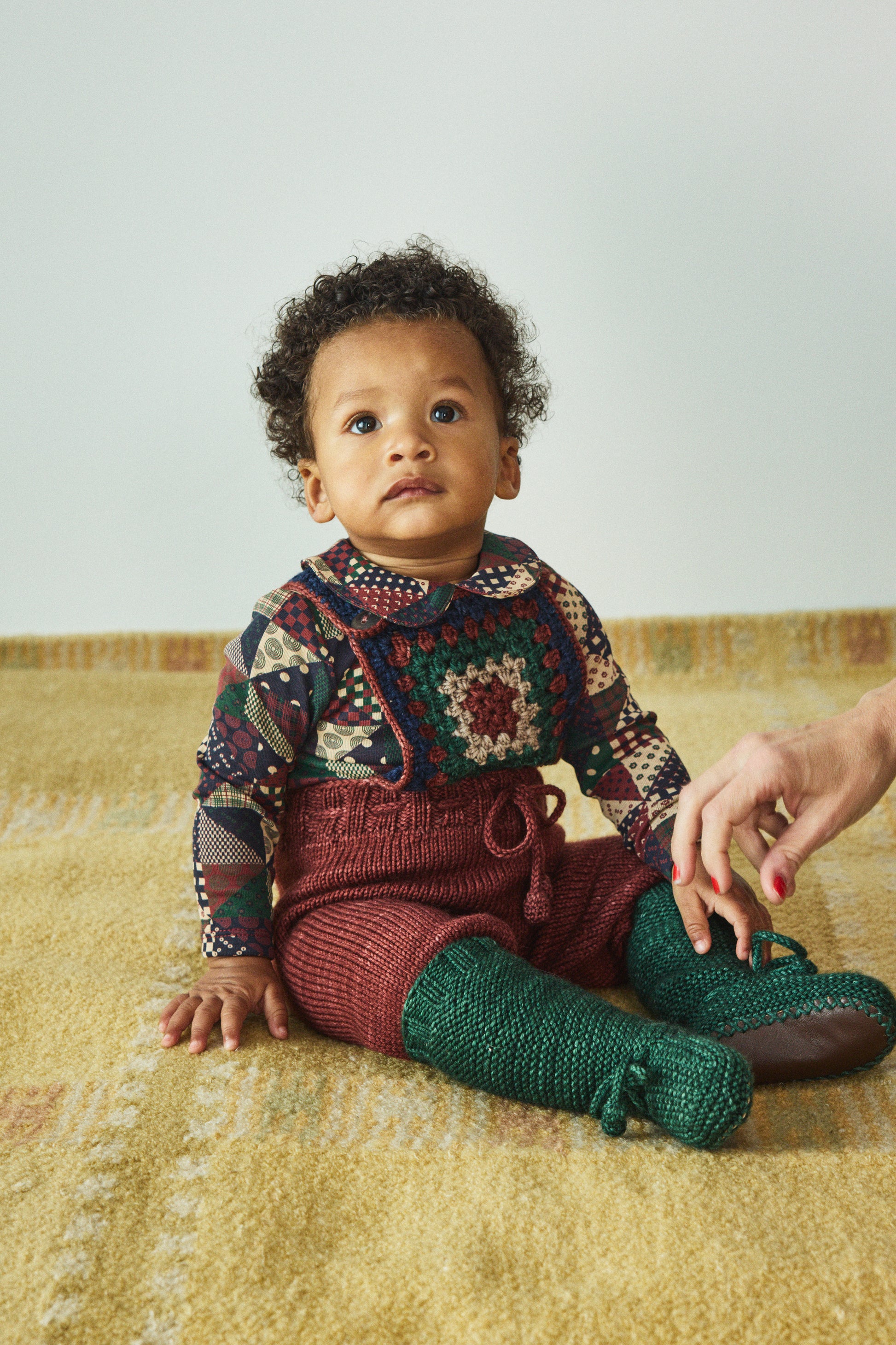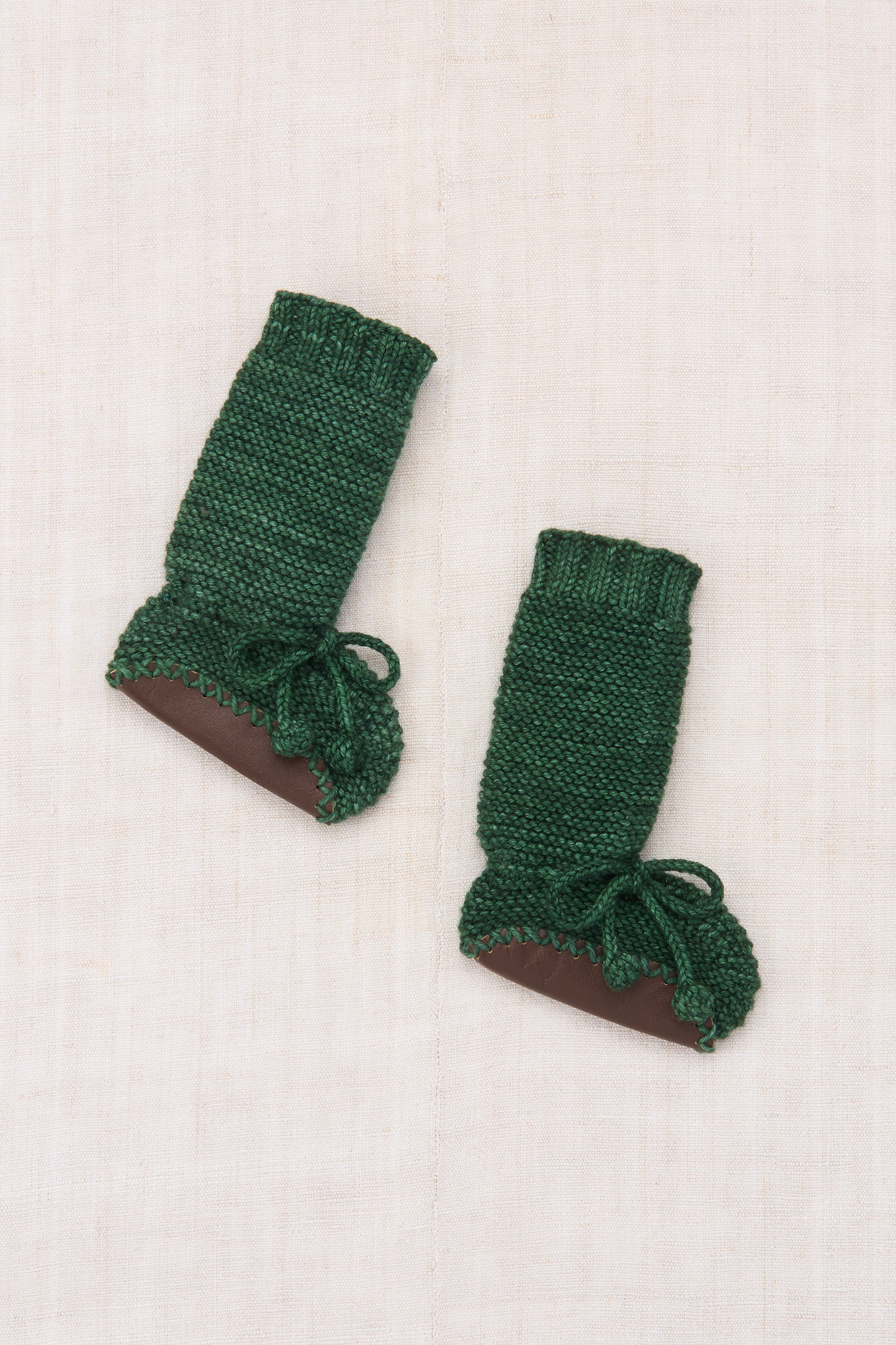 A tall hand-knit bootie set in Merino wool, featuring popcorn ties at the ankle for a secure fit, ribbed cuffs, and soft leather soles.