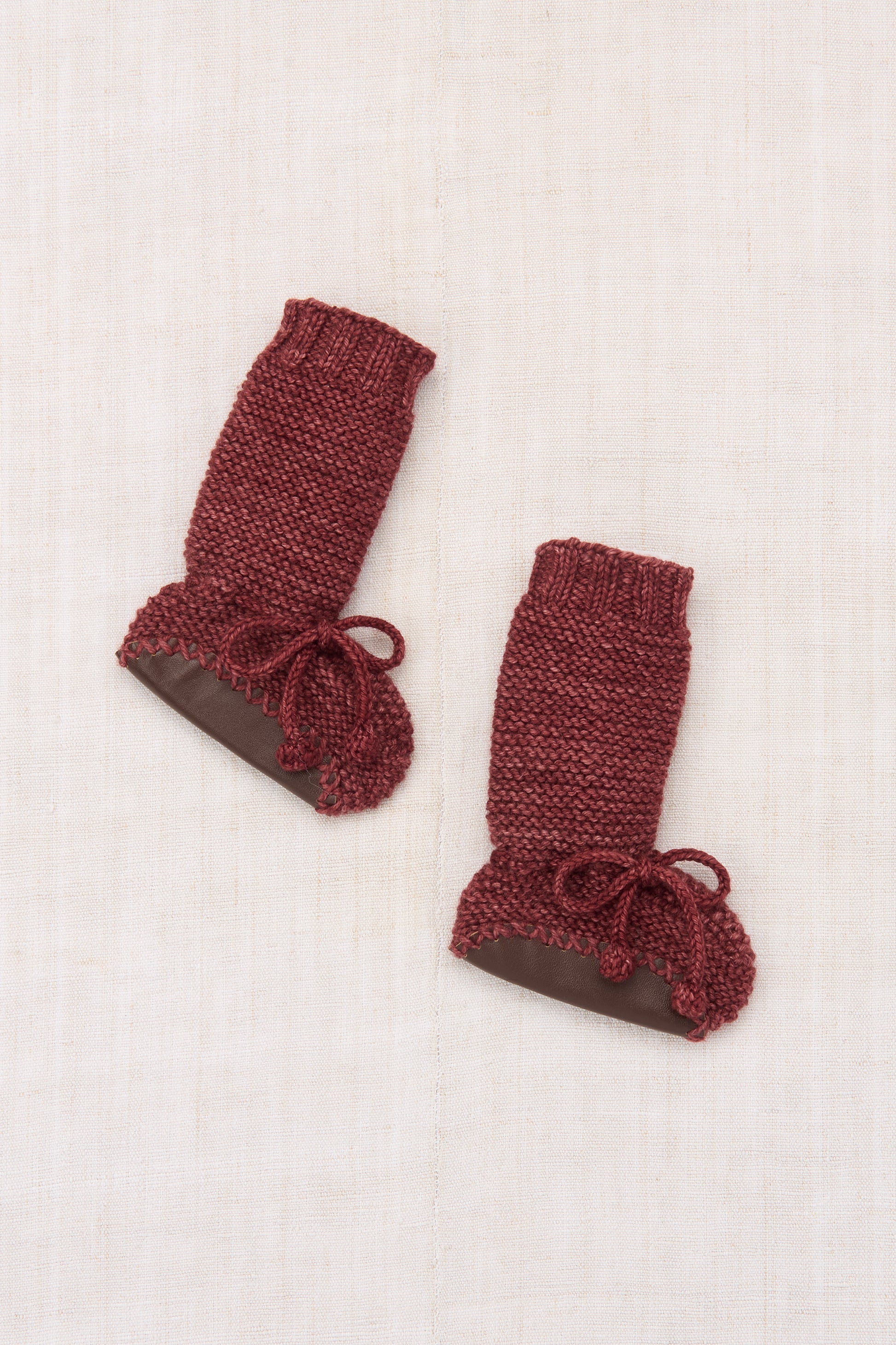 A tall hand-knit bootie set in Merino wool, featuring popcorn ties at the ankle for a secure fit, ribbed cuffs, and soft leather soles.