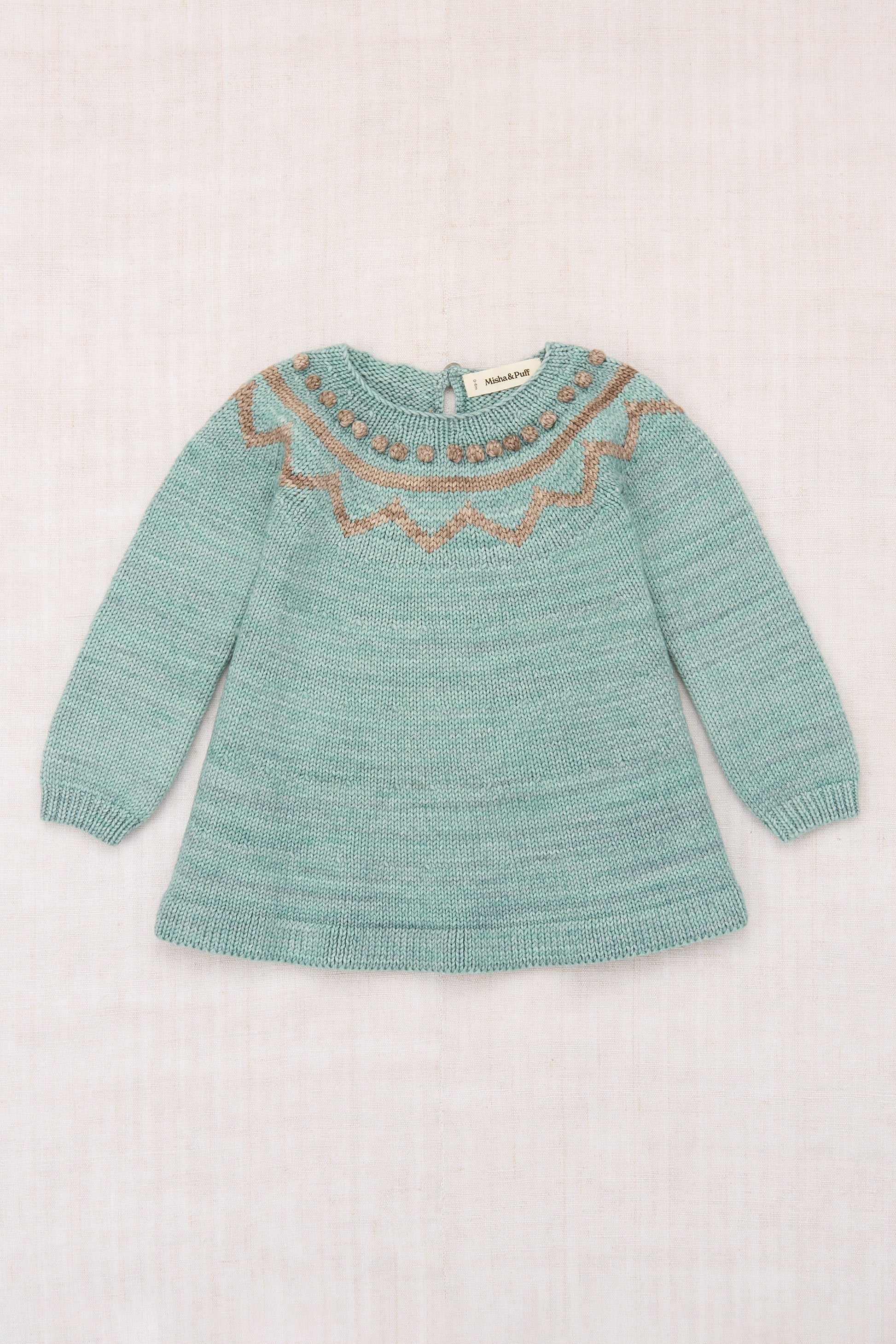 A long-sleeved dress in Merino wool, featuring an A-line silhouette, hand-worked popcorn stitch detail, a zig zag motif, open neckline, and a horn button keyhole closure at the back neck.
