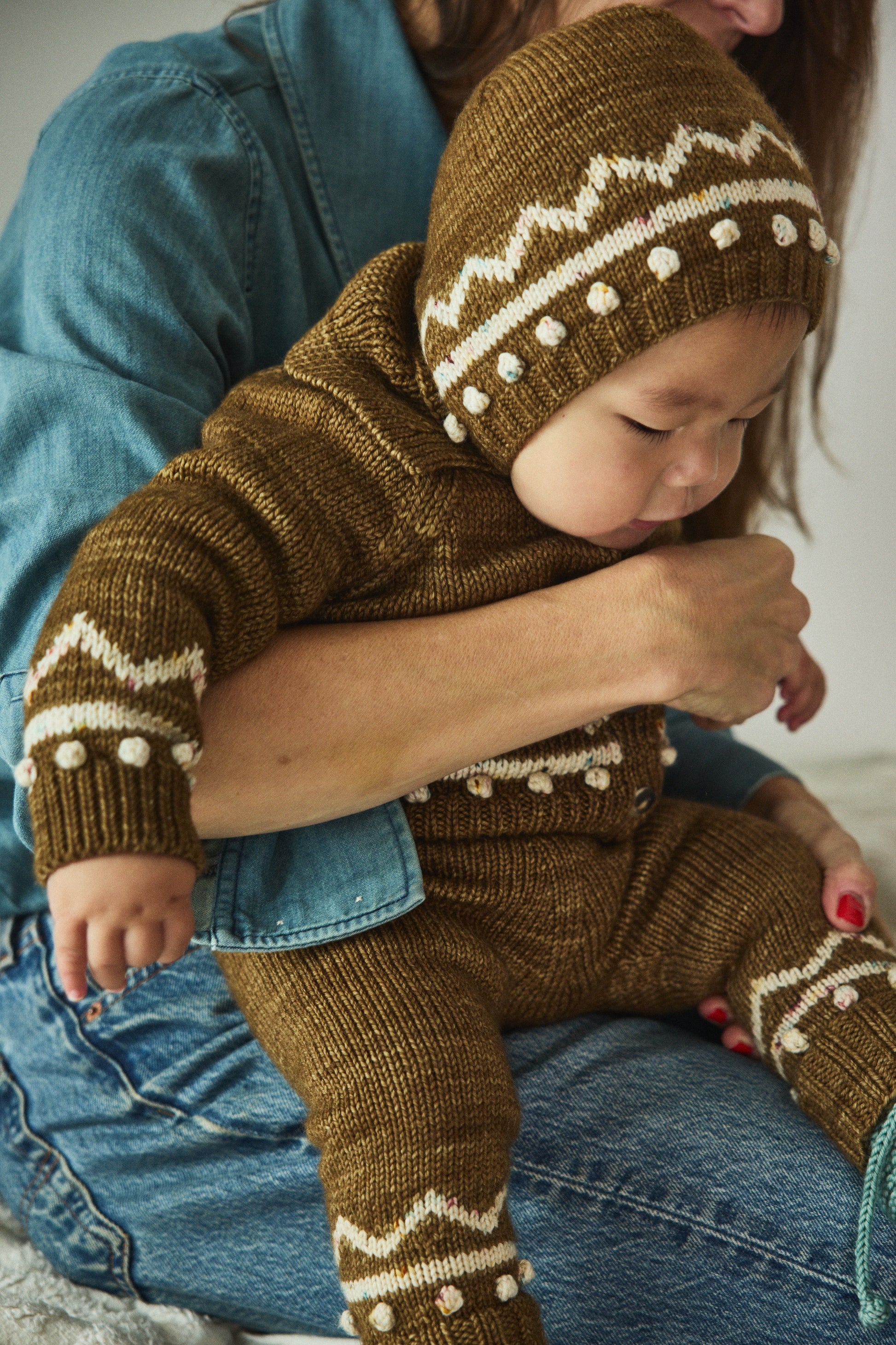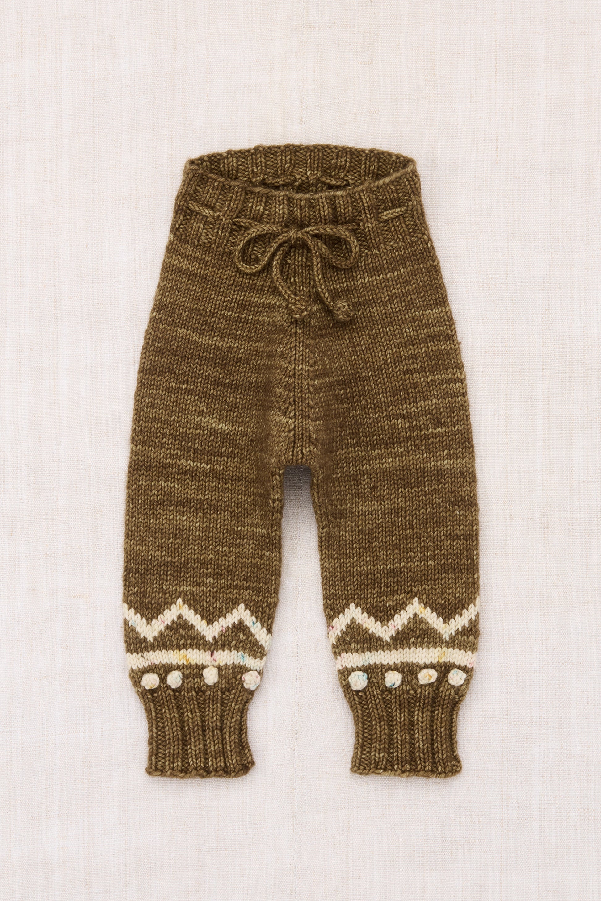 A cozy hand-knit jogger-style legging in Merino wool, featuring hand-worked popcorn stitch details, a zig zag motif, a ribbed waistband with a popcorn-tie drawstring for a secure fit, and ribbed cuffs.