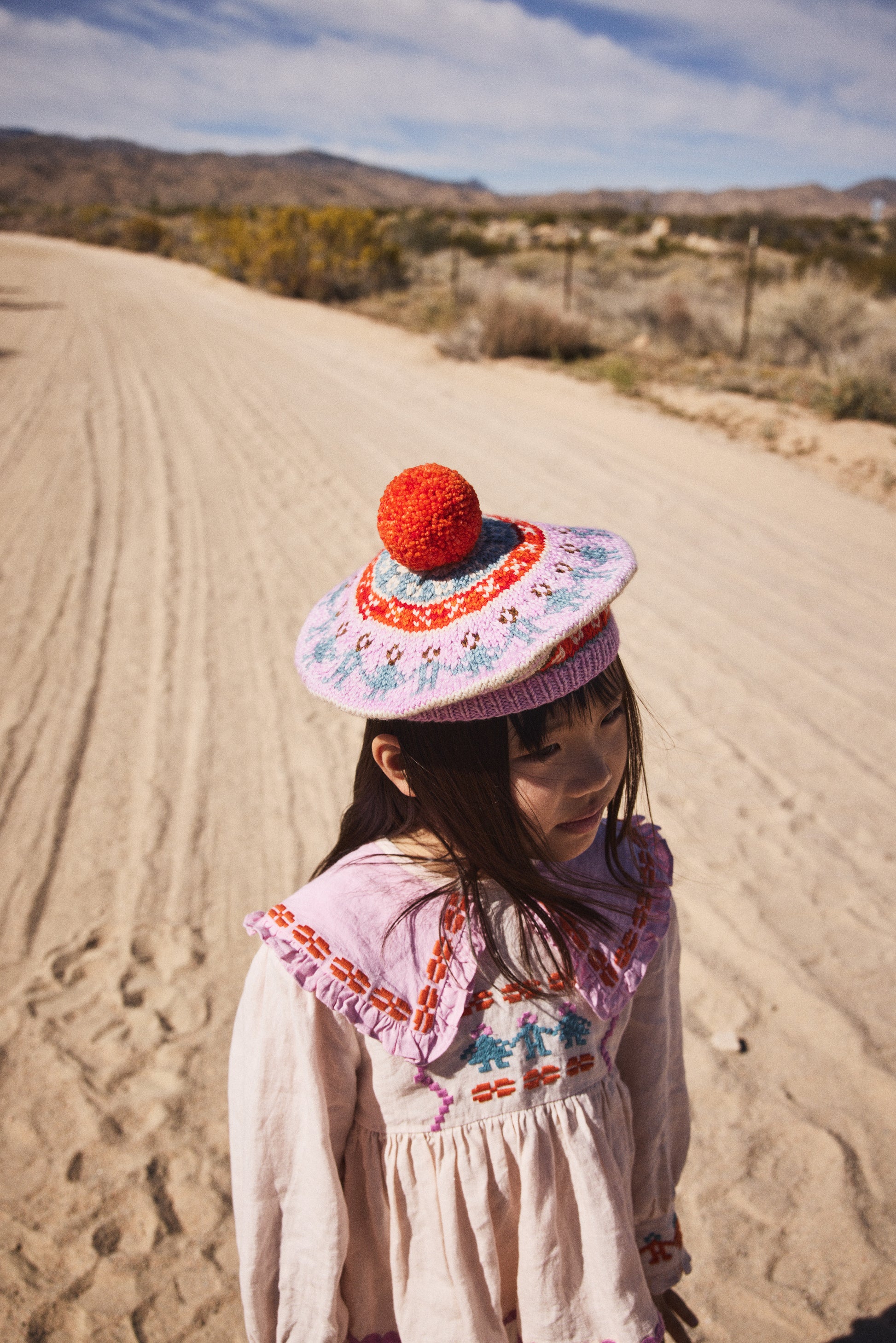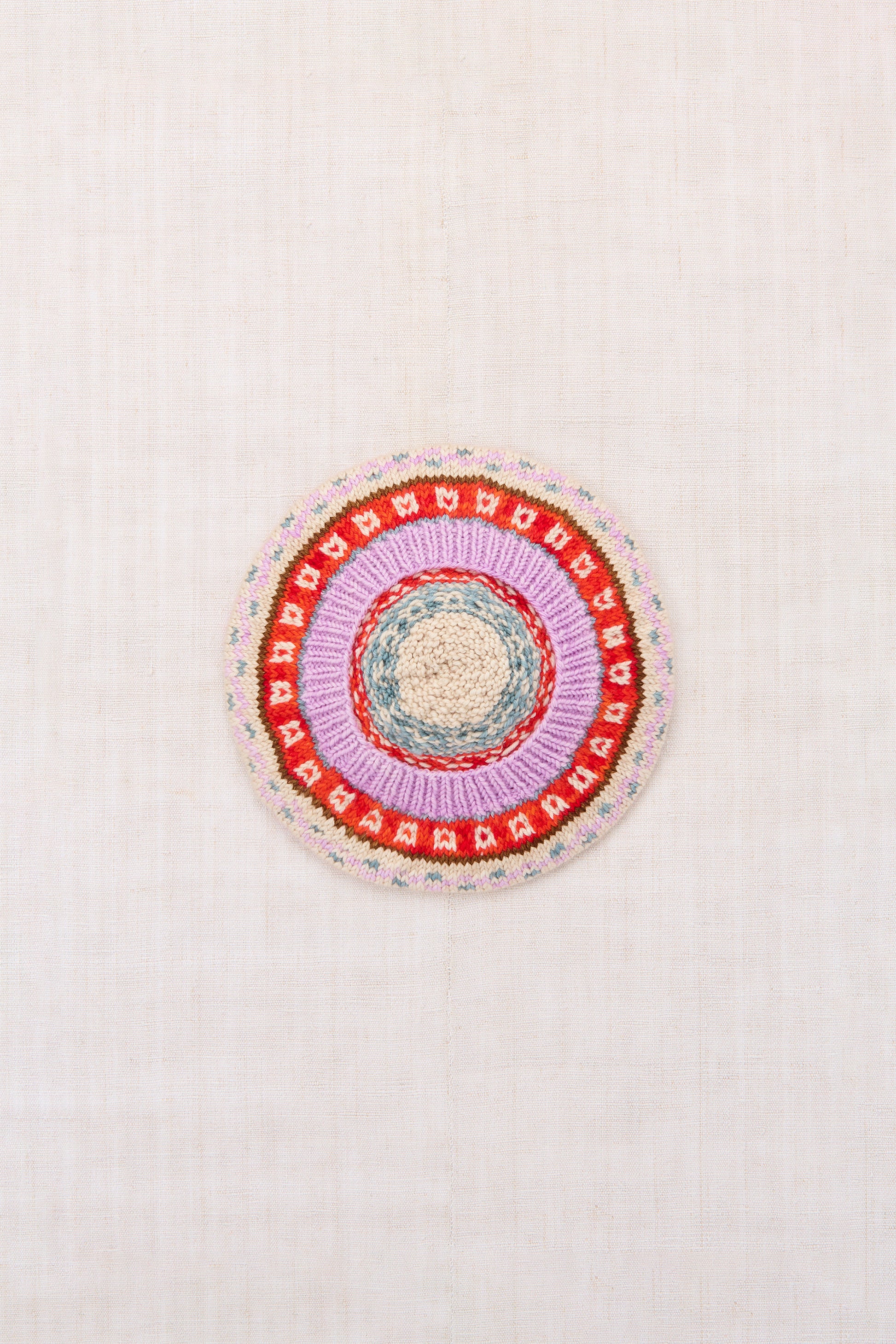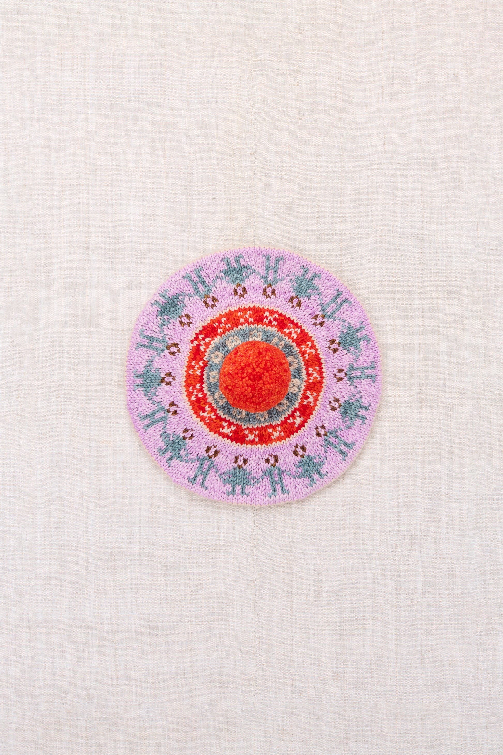 A hand-knit beret in Merino wool, featuring a Fair Isle-inspired colorwork motif and pom-pom top.