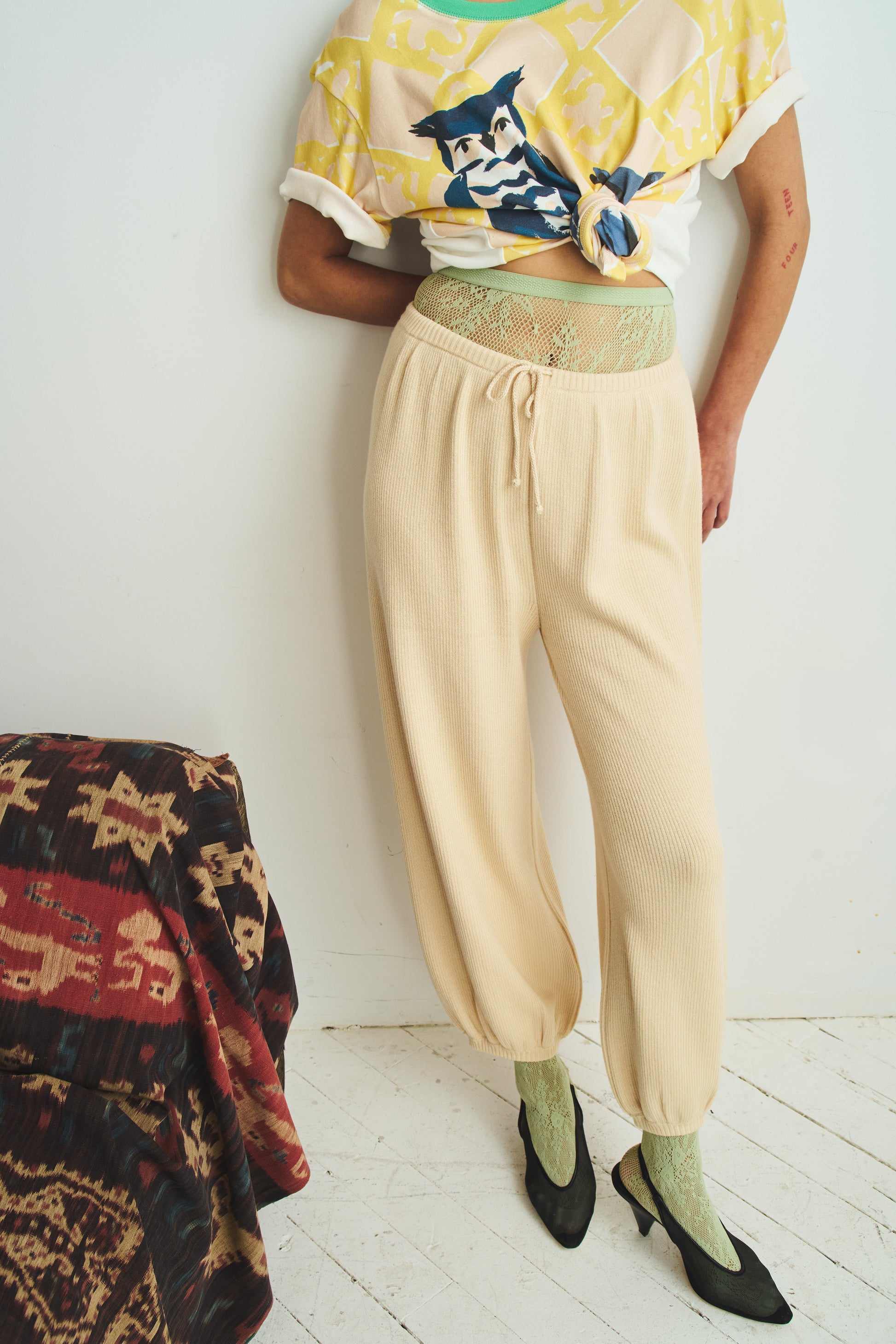 A fine-ribbed pant in Pima cotton knit, featuring an elastic drawstring waistband and a roomy leg with a cinched ribbed cuff just above the ankle. Note: this style fits true to size in cotton (unlike the wool version, which we recommend sizing down for a less voluminous fit).