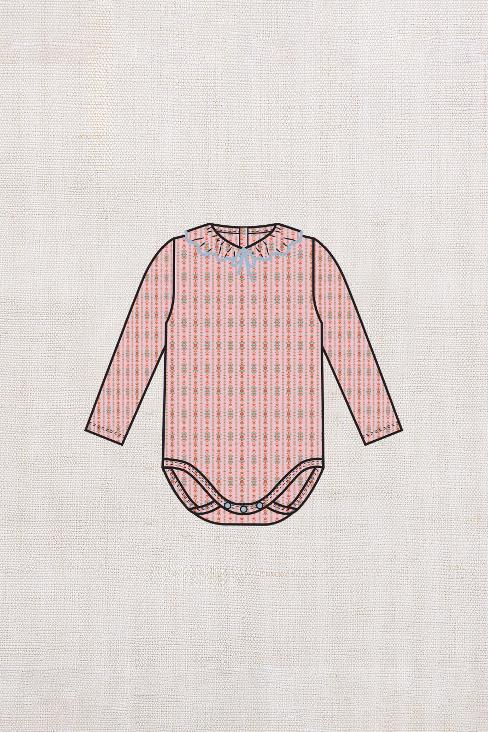 A classic long-sleeved onesie in organic Pima cotton, featuring a ruffle collar with a contrast merrowed edge and mini bow. Finished with snap closure at the bottom and back neck — perfect on its own or layered for a versatile, buildable look.