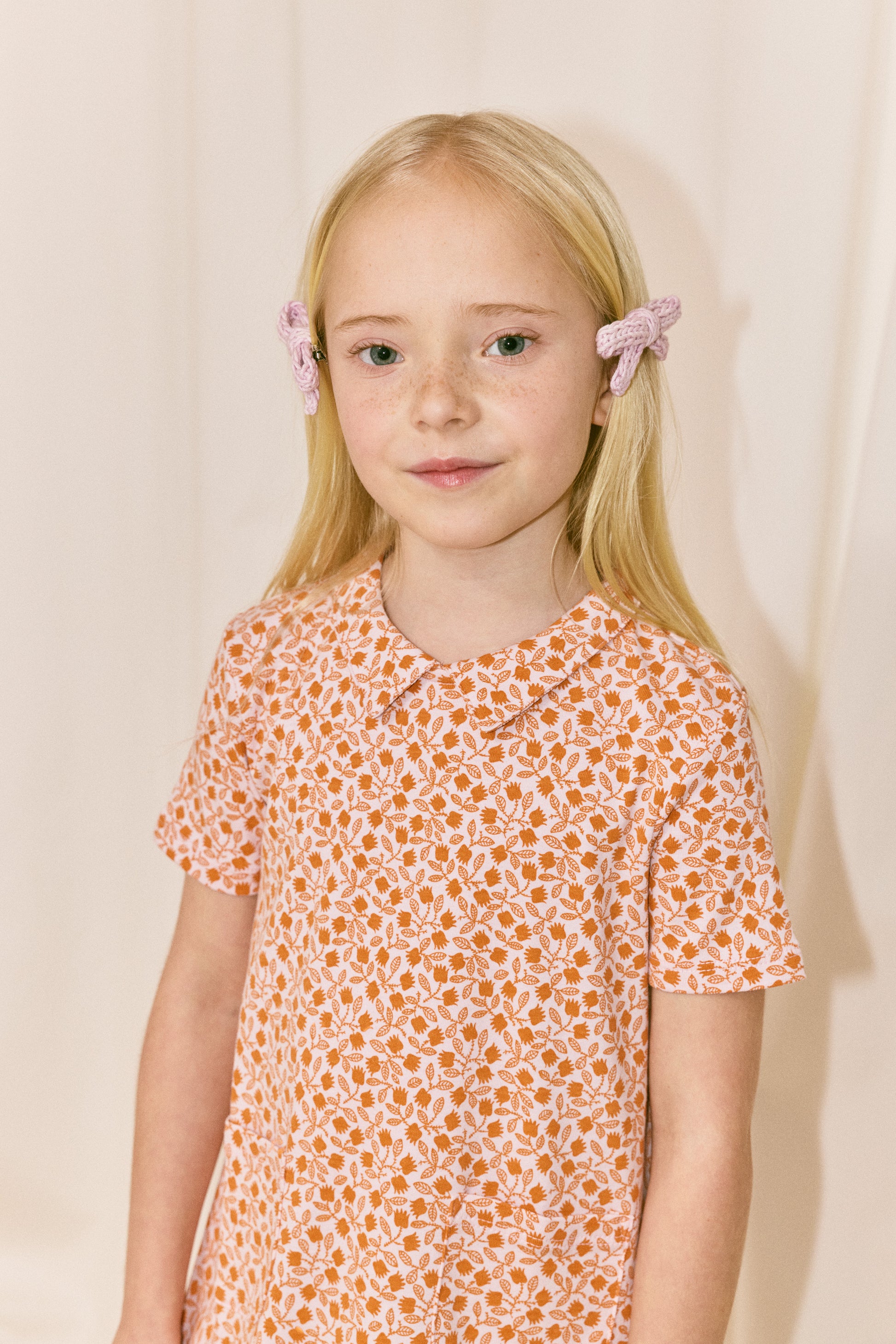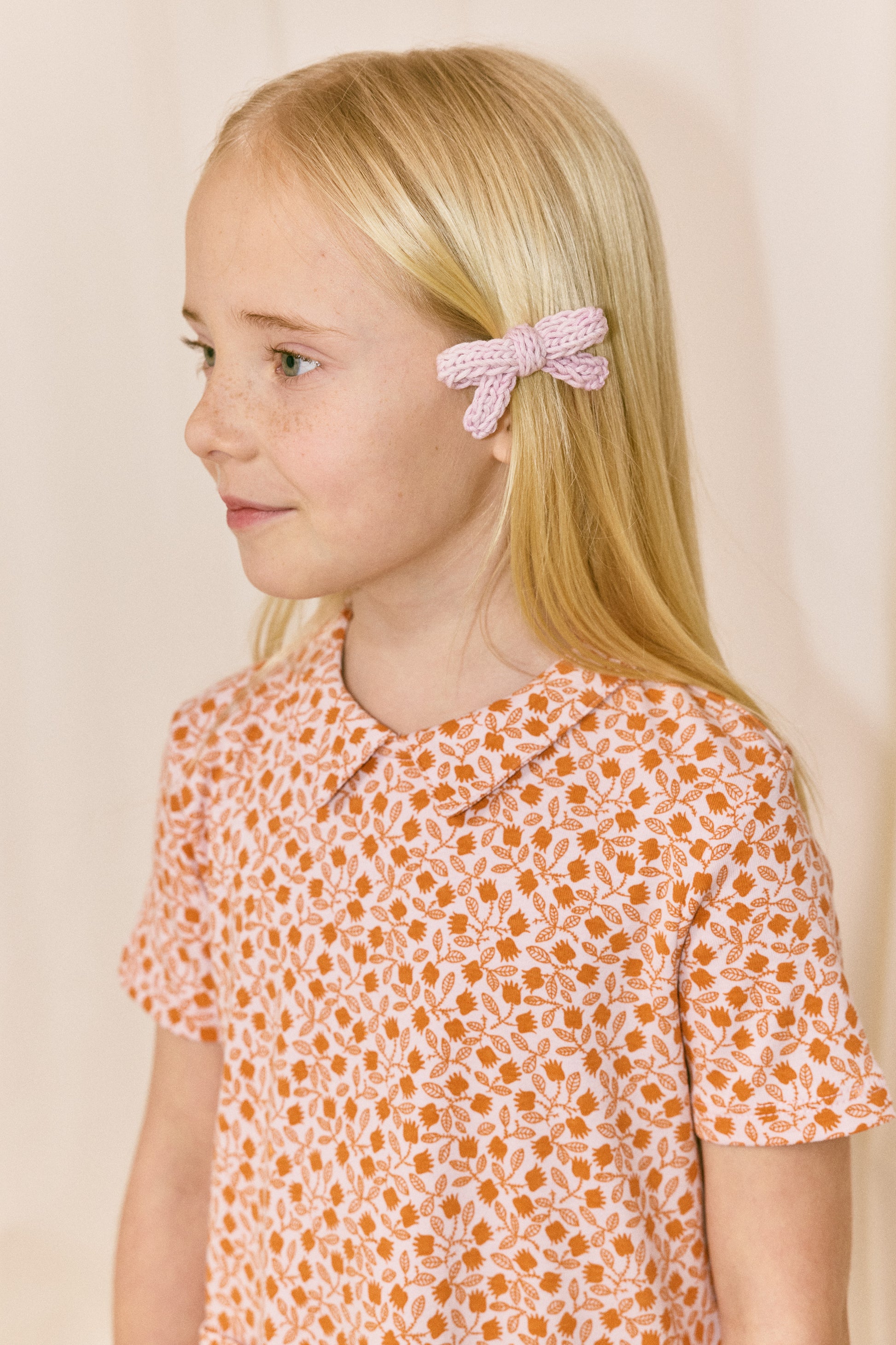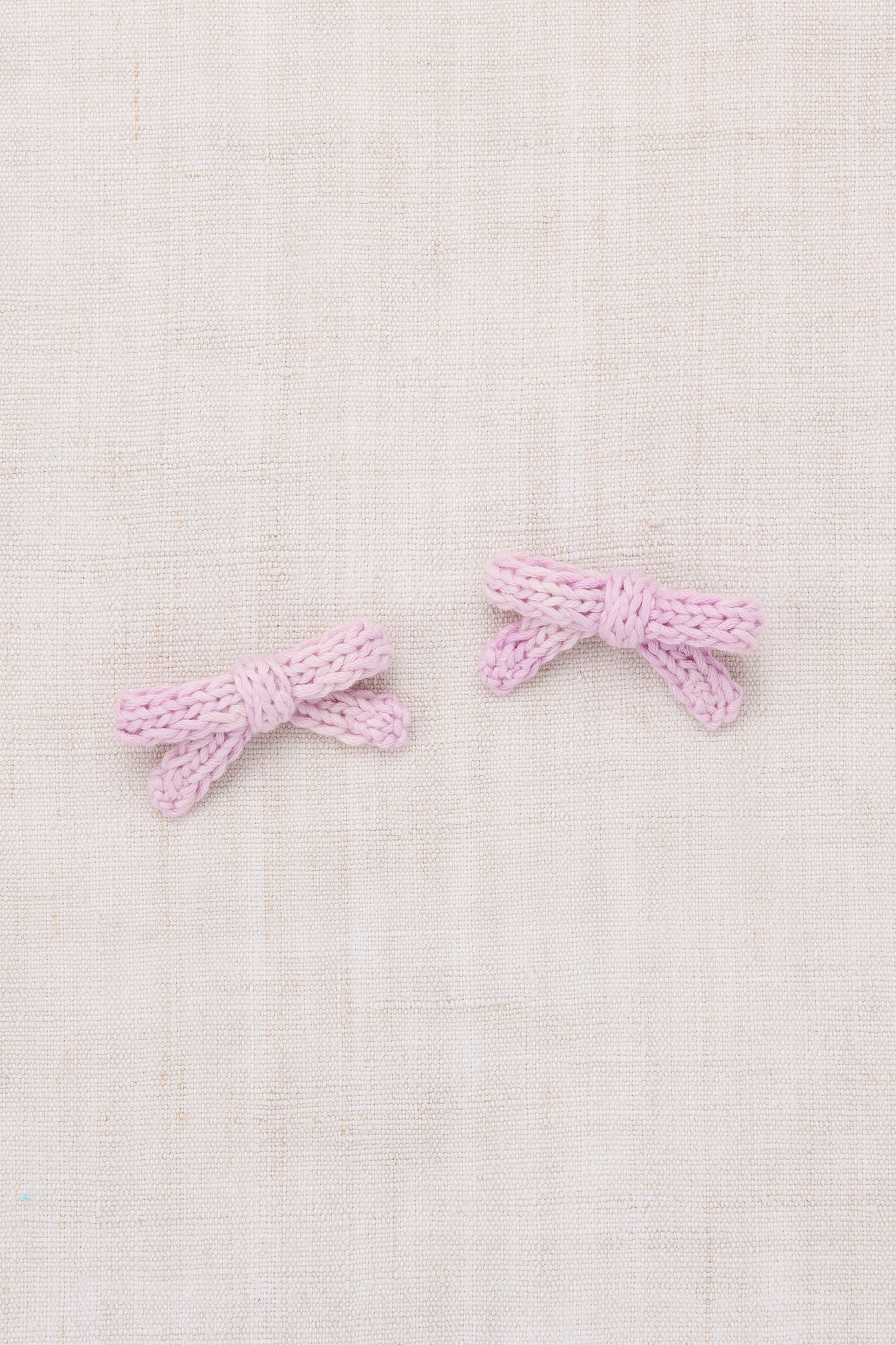 A set of hand-knit slim bows on alligator clips in Pima cotton. For matching your favorite knitwear, adding a pop of color, or gifting to a friend.