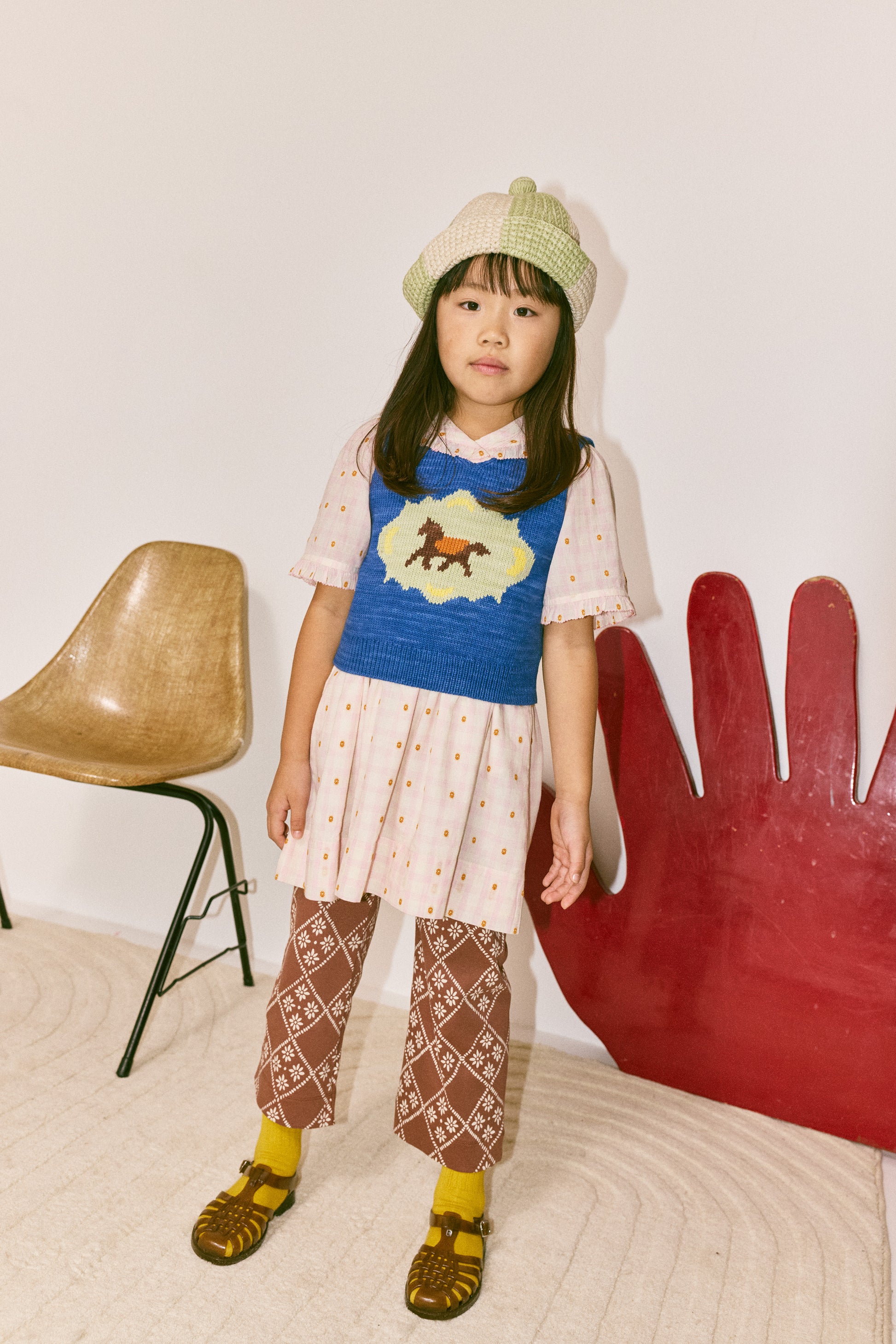 A v-neck vest in a Pima cotton knit, featuring a graphic intarsia, a slight bubbly shape, and ribbed hem.