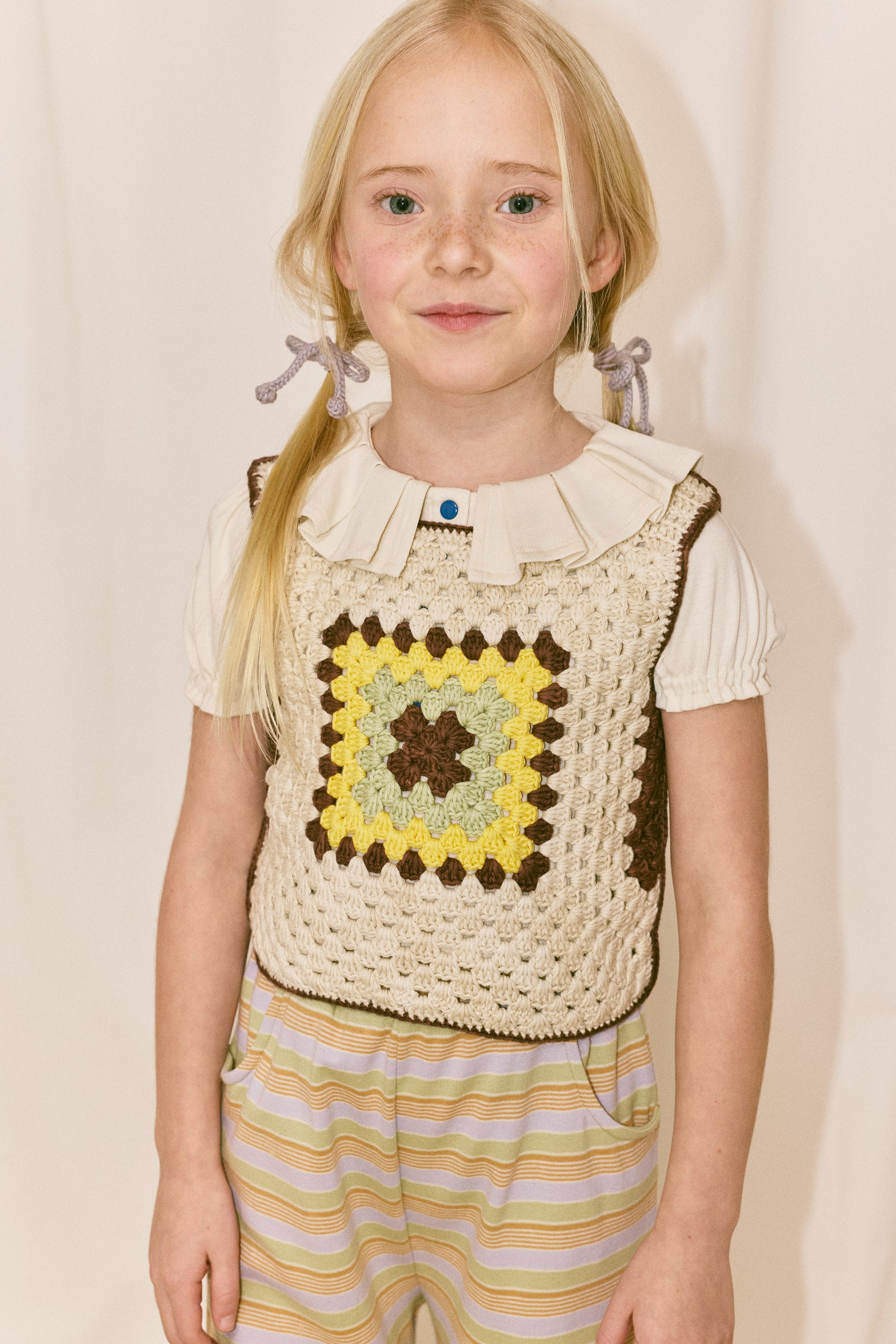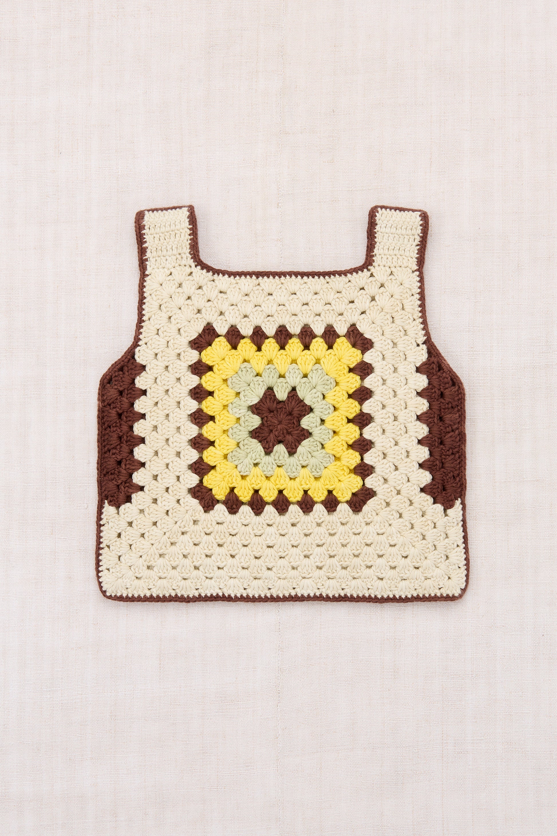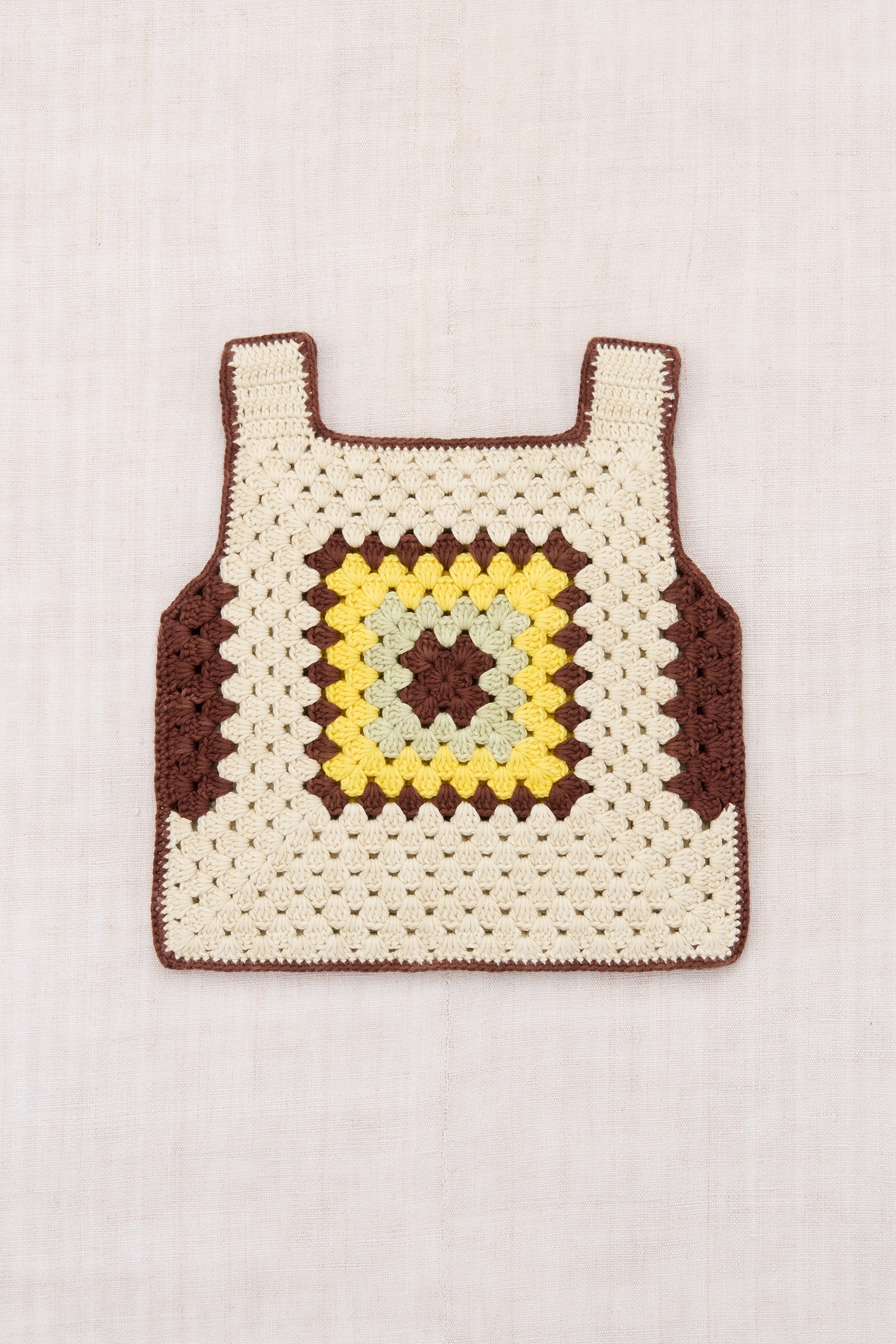 A boxy hand-crocheted tank vest in Pima cotton, featuring a granny square detail on the front and back. A show-stopping piece — perfect for layering.