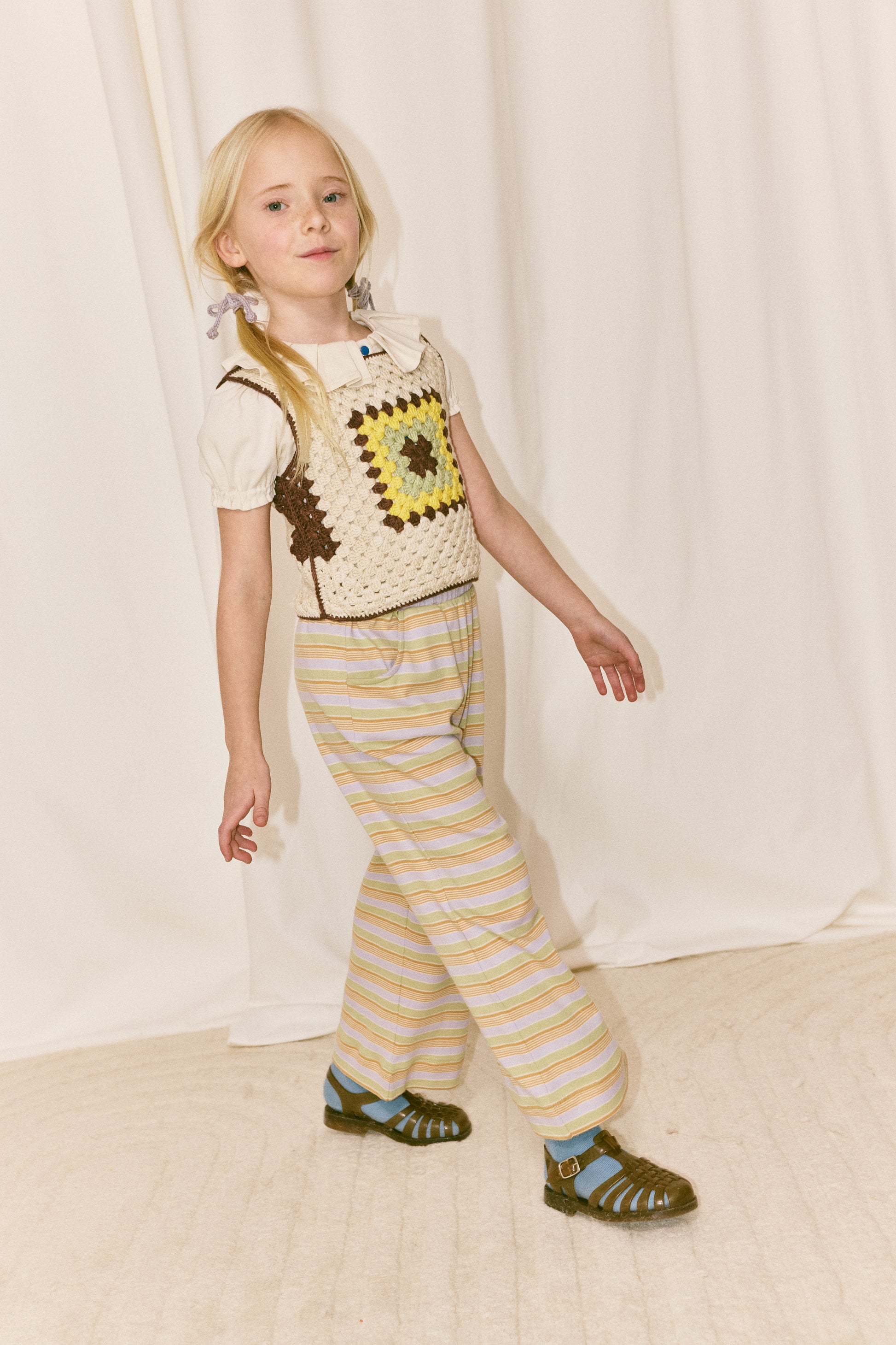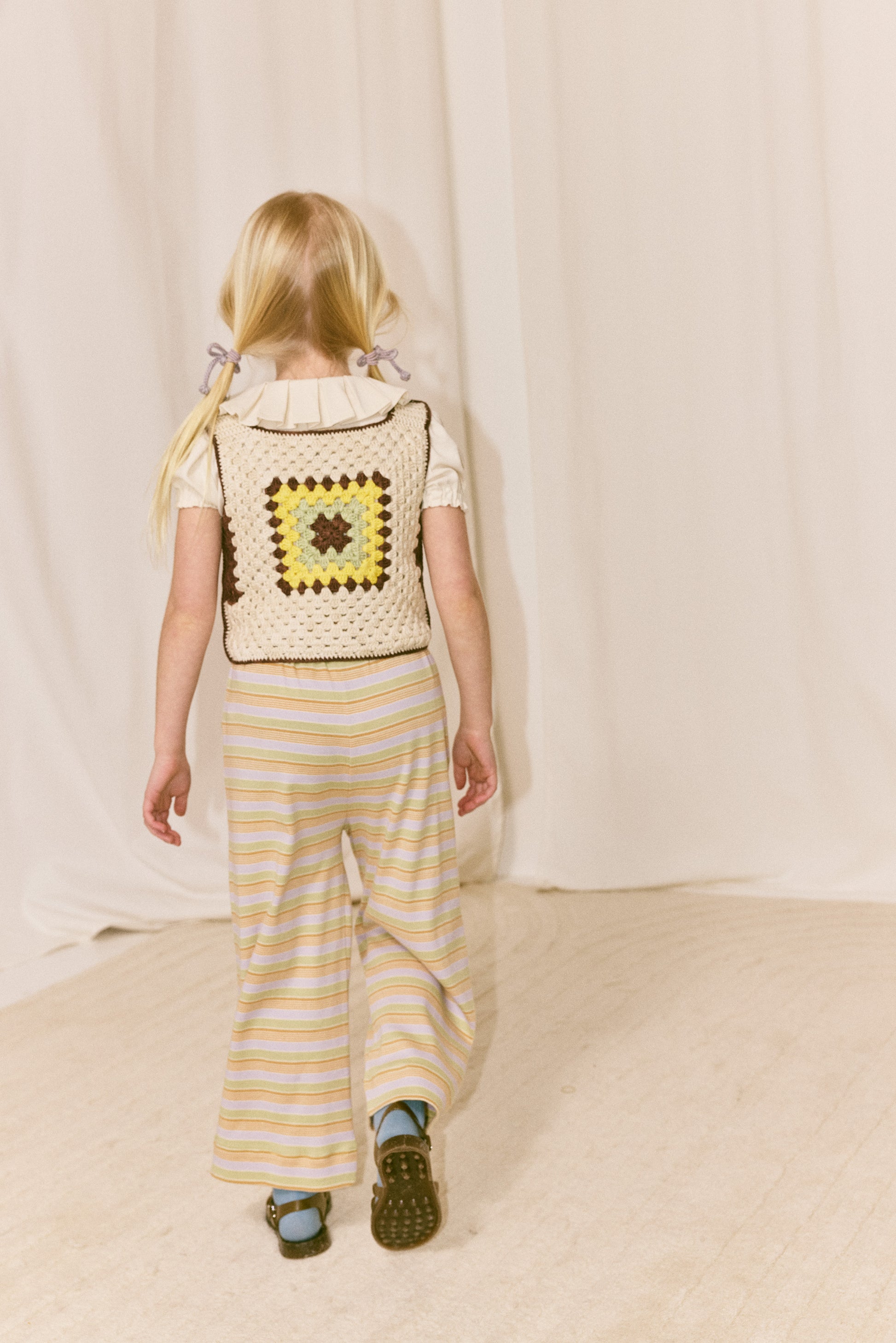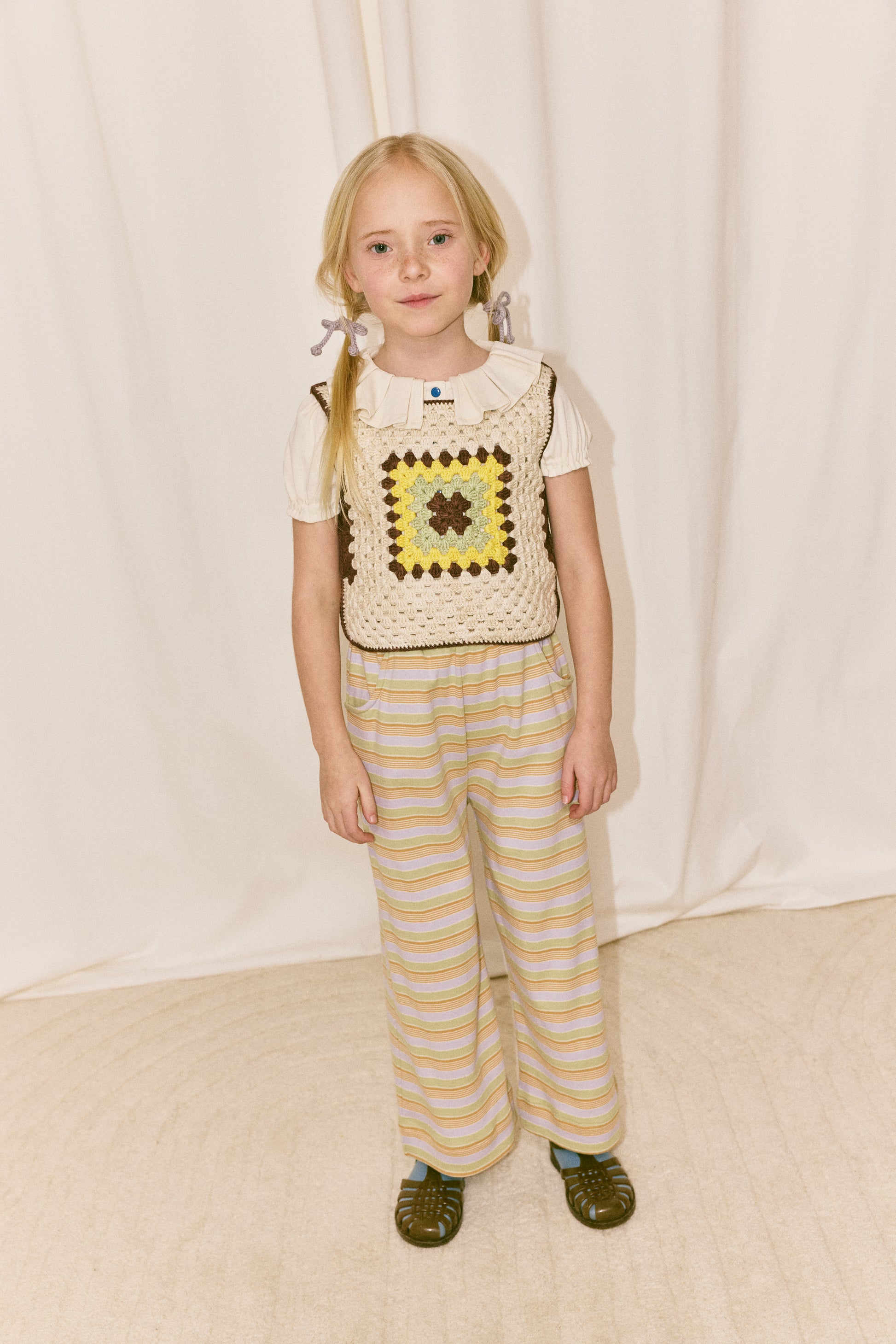 A boxy hand-crocheted tank vest in Pima cotton, featuring a granny square detail on the front and back. A show-stopping piece — perfect for layering.