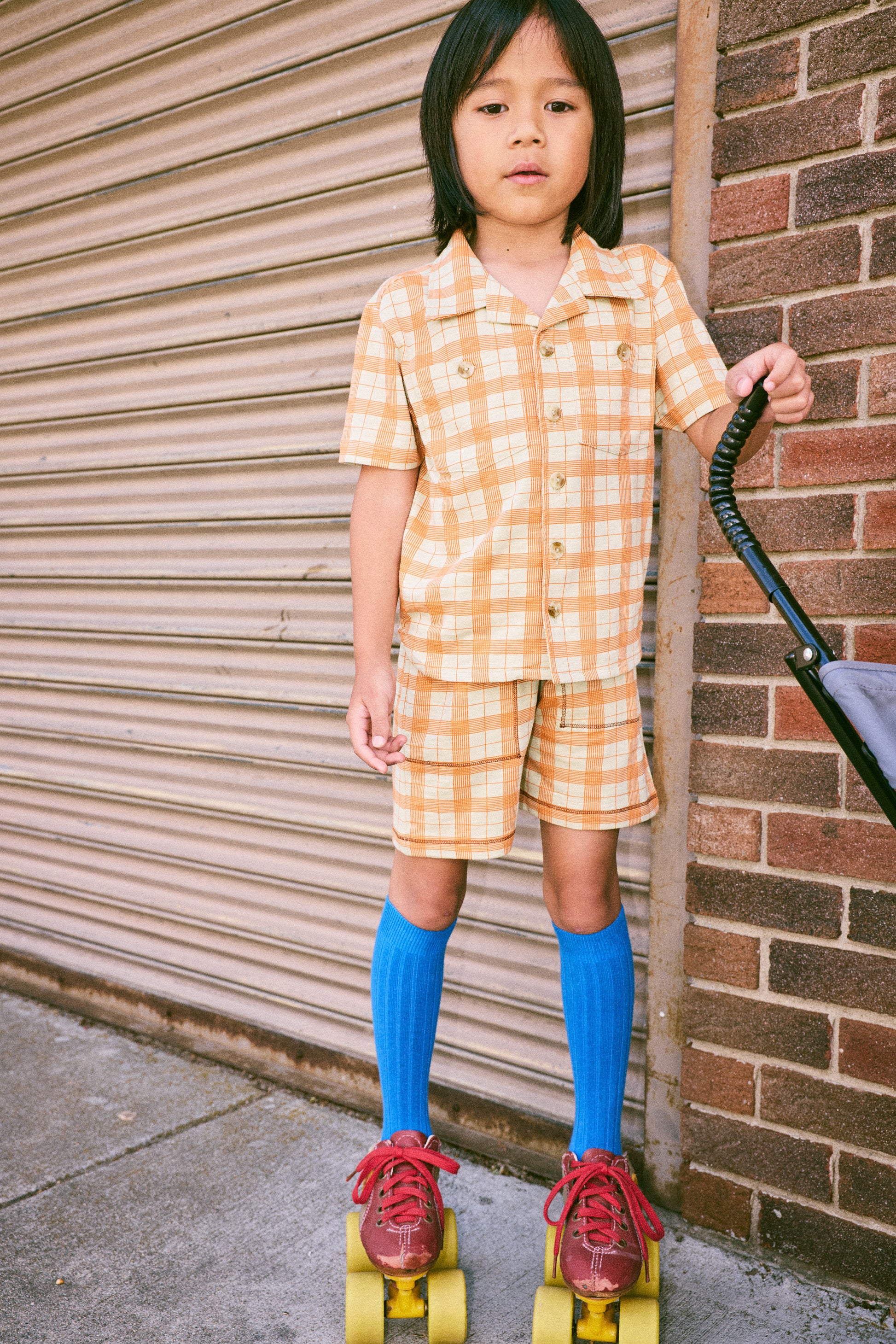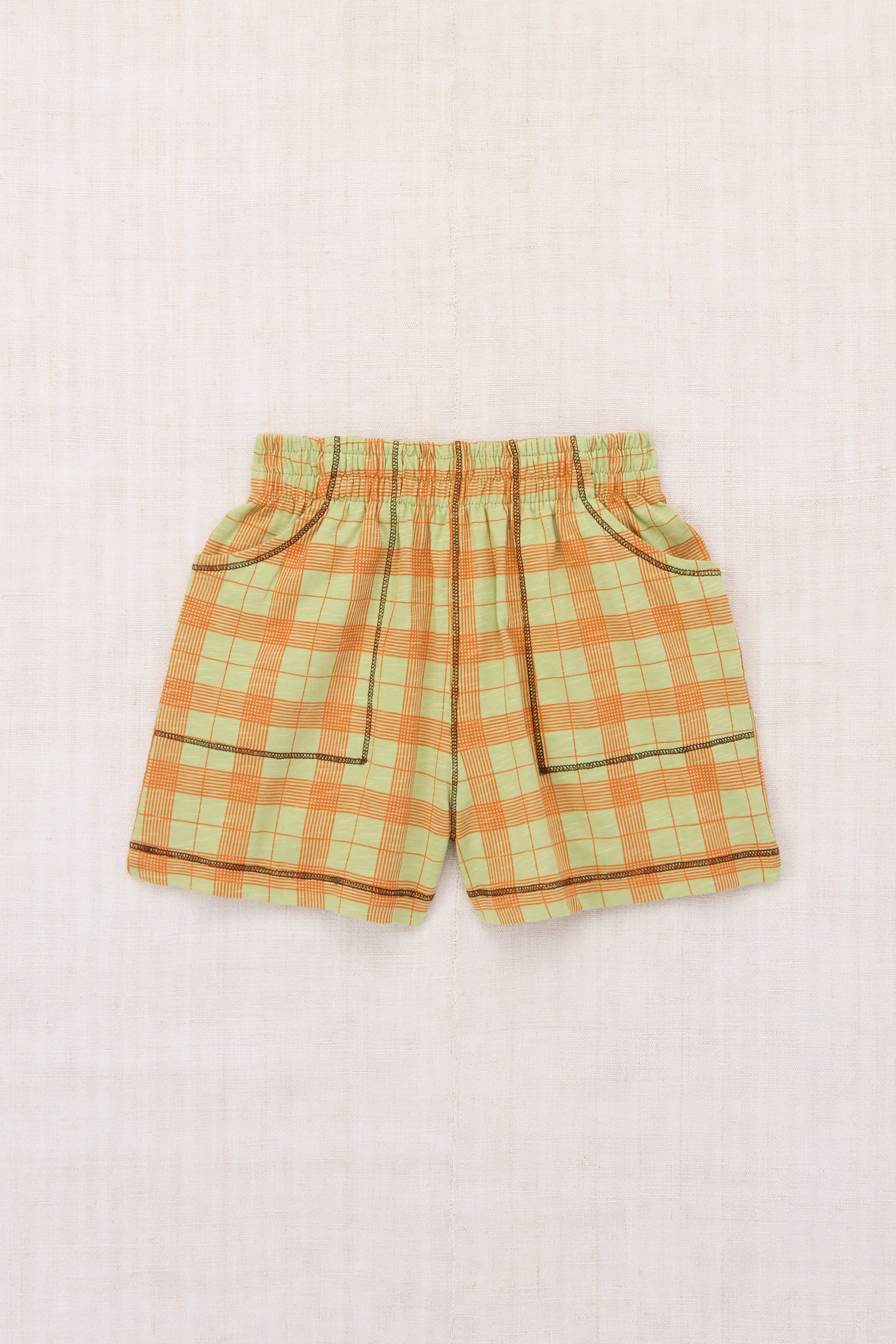 A pull-on short in organic cotton slub jersey, featuring a gathered elastic waistband, two patch pockets, and sporty contrast stitching. This slub jersey is slightly thicker than our Pima cotton styles, with a touch of structure.