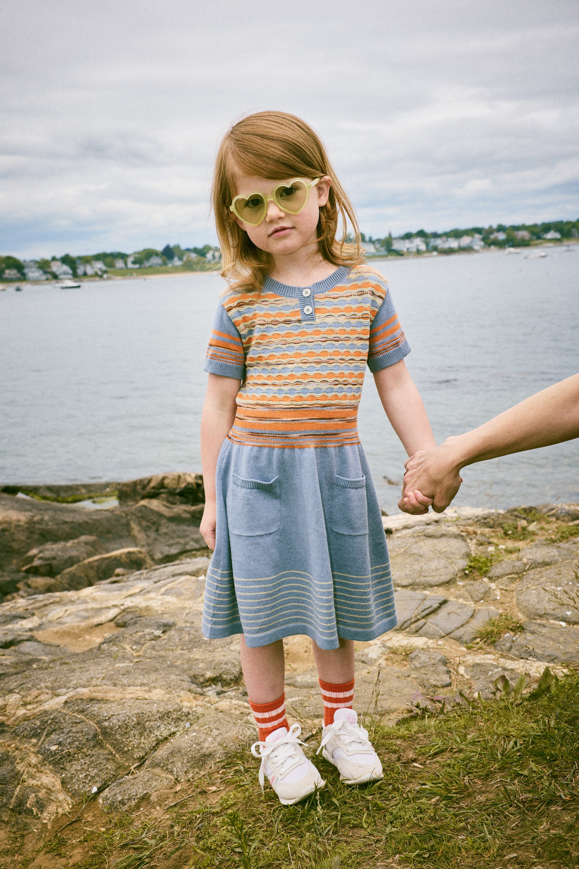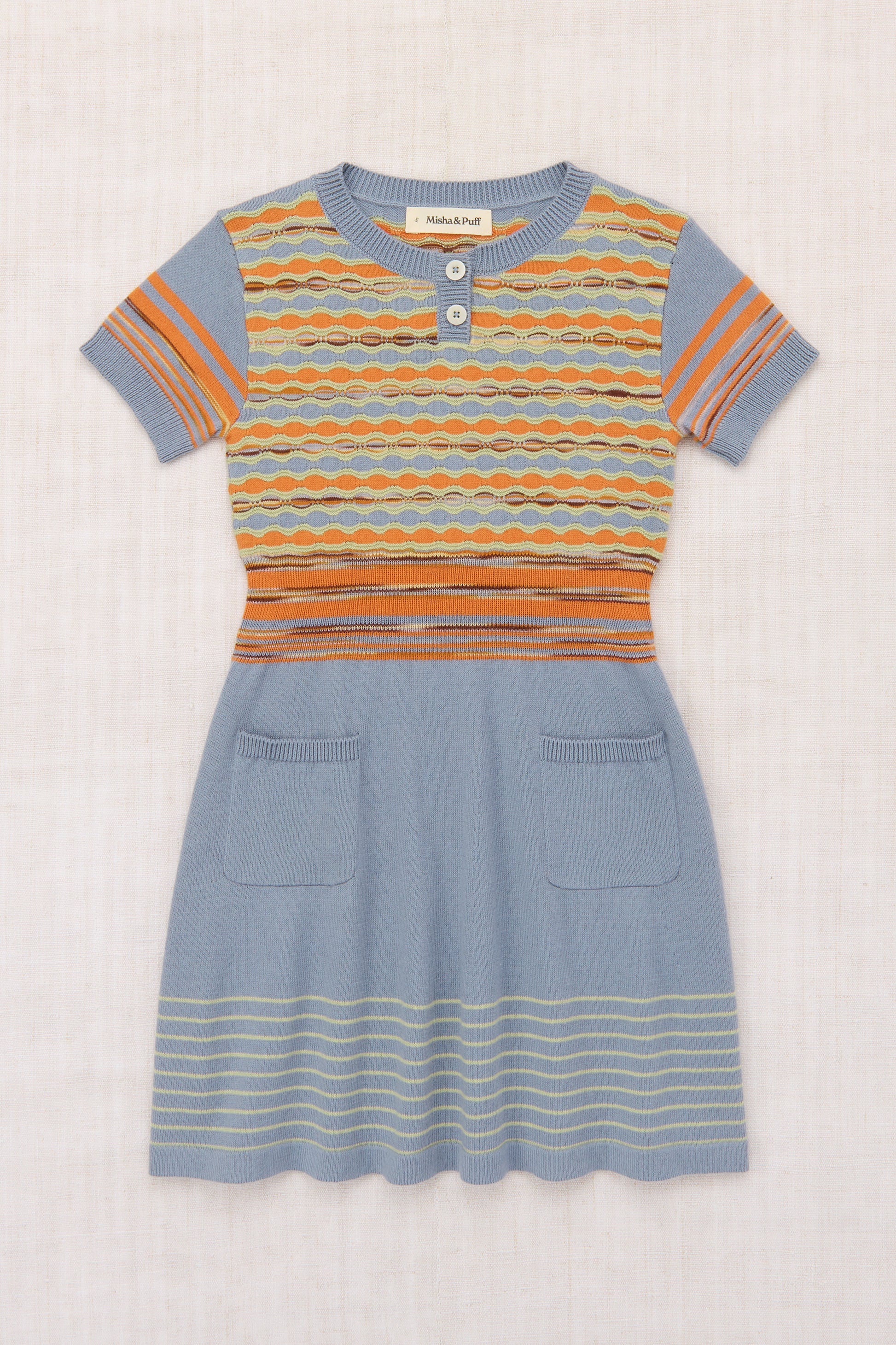 A short-sleeved dress in fine-gauge Pima cotton knit, featuring a multi-color wavy pattern with raised details, two patch pockets, striped sleeves and hem, a space dye waist, and ribbed trim with a corozo button placket.