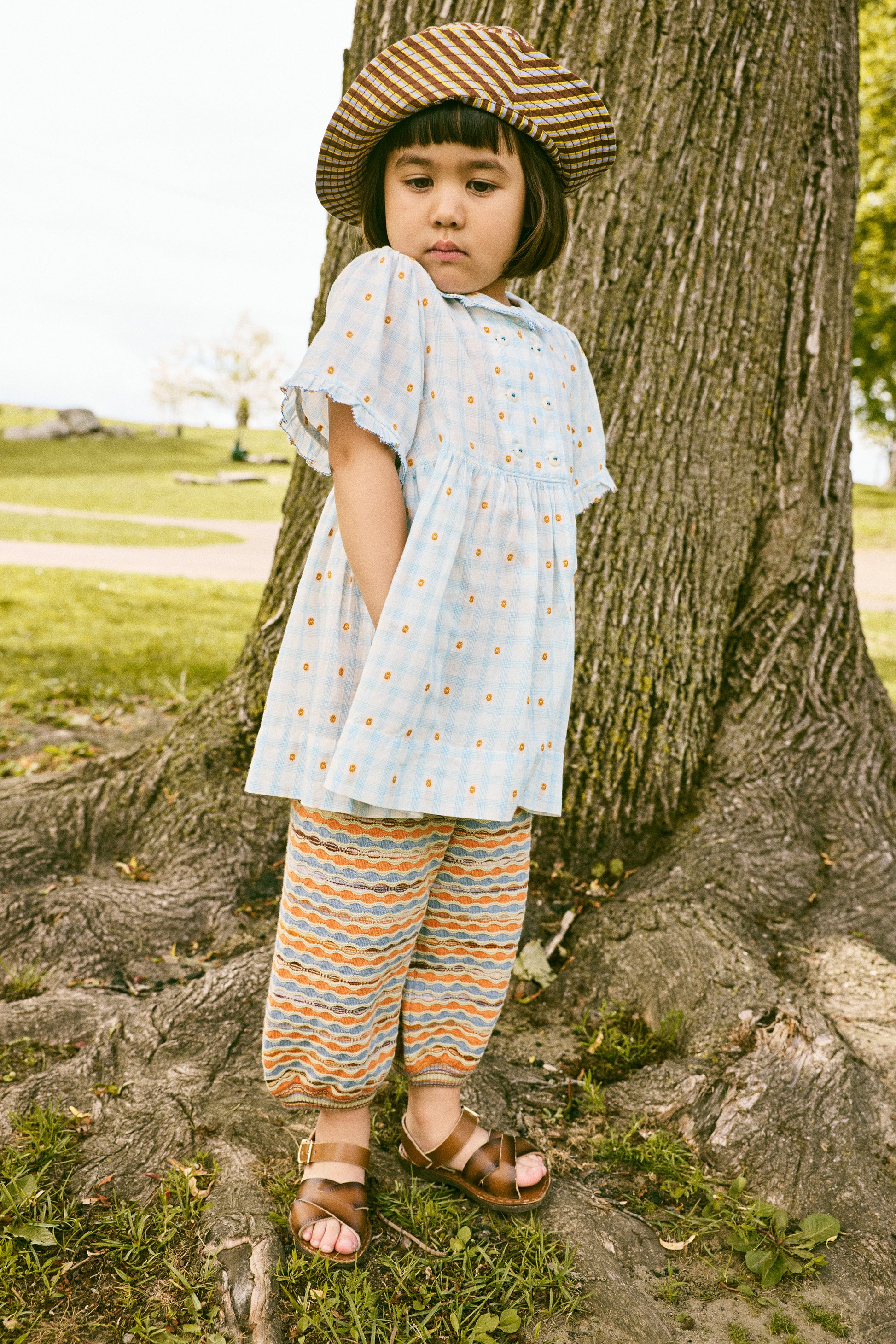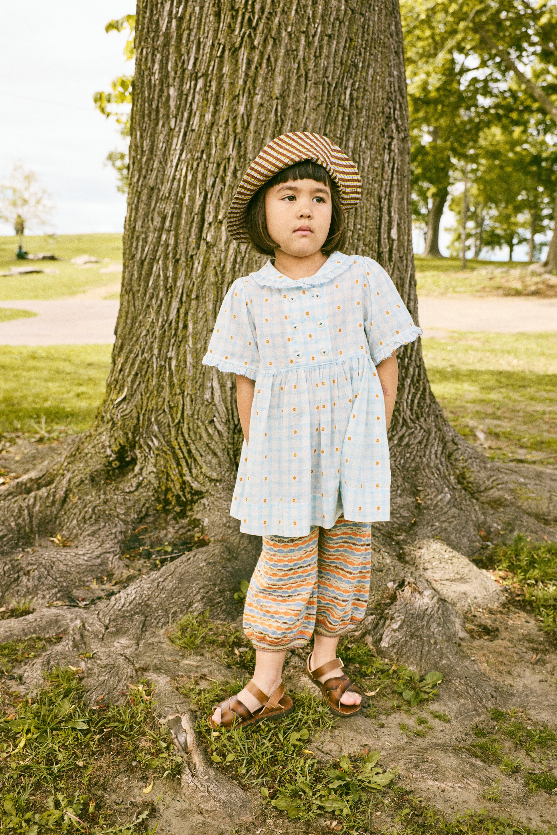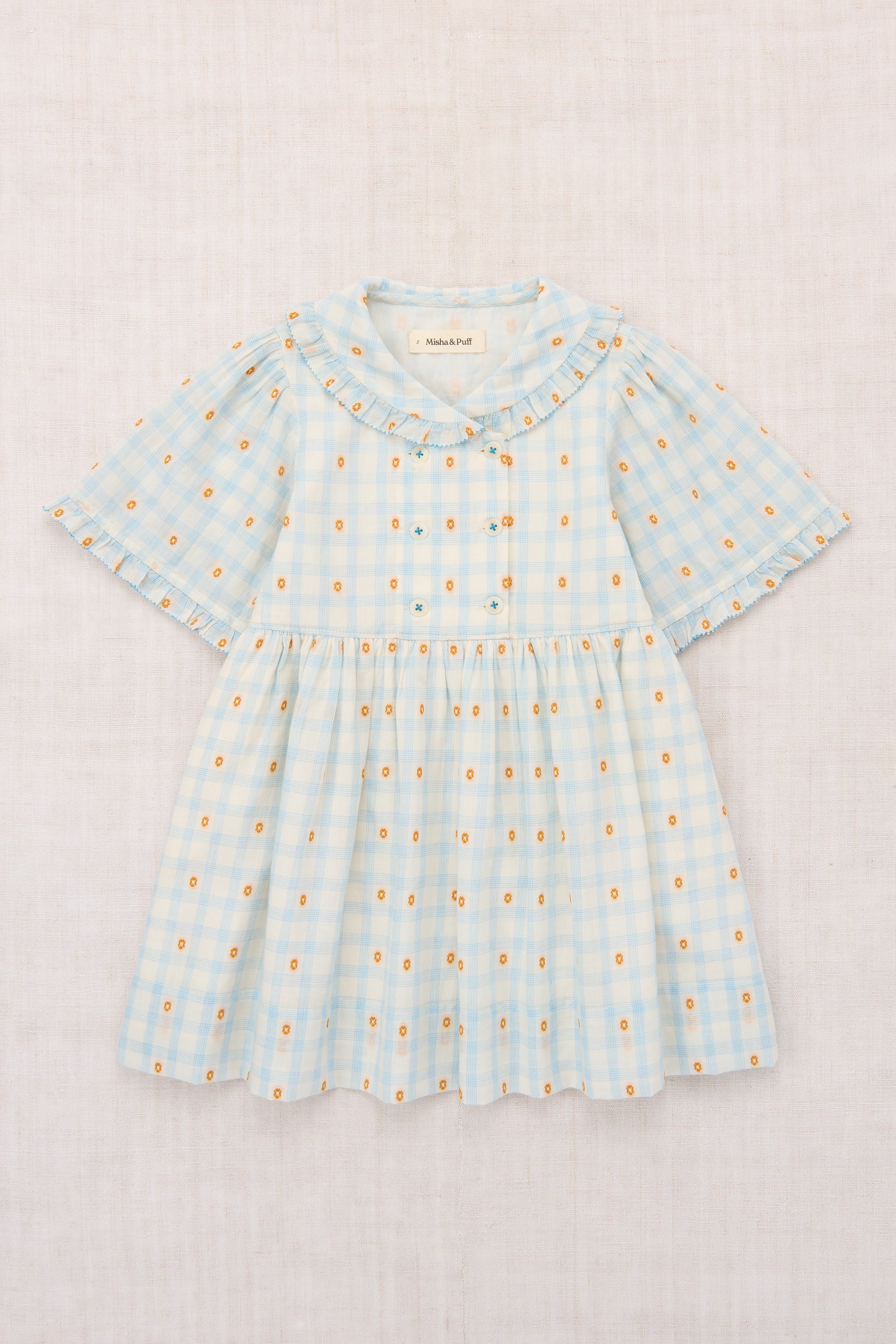A dress in lightweight organic cotton plaid, with a woven textured design, rounded collar, elbow-length sleeves, gathered waist, ruffle trim with edge detail, and a double-breasted corozo button closure. Lined in cotton voile and finished with French seams.