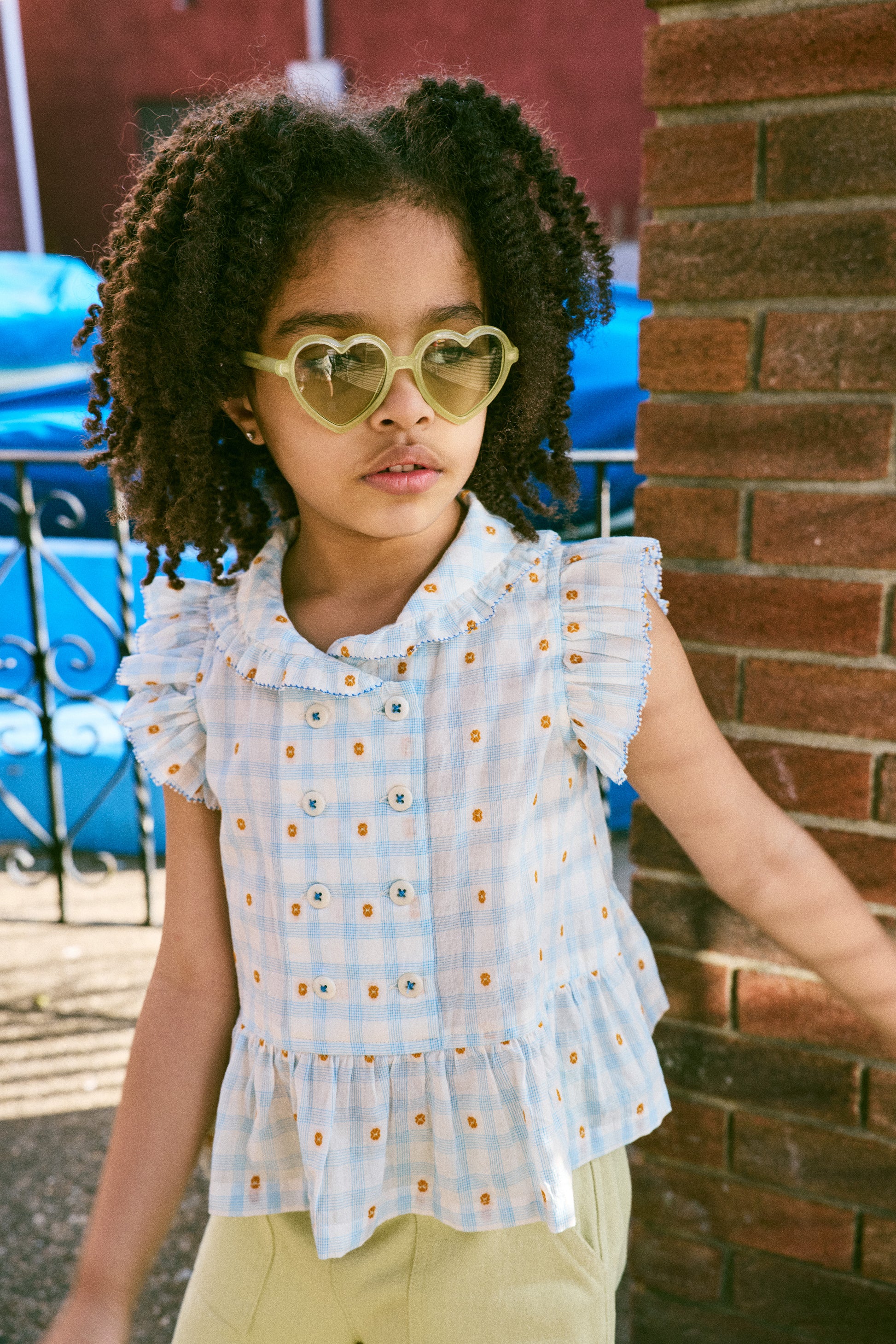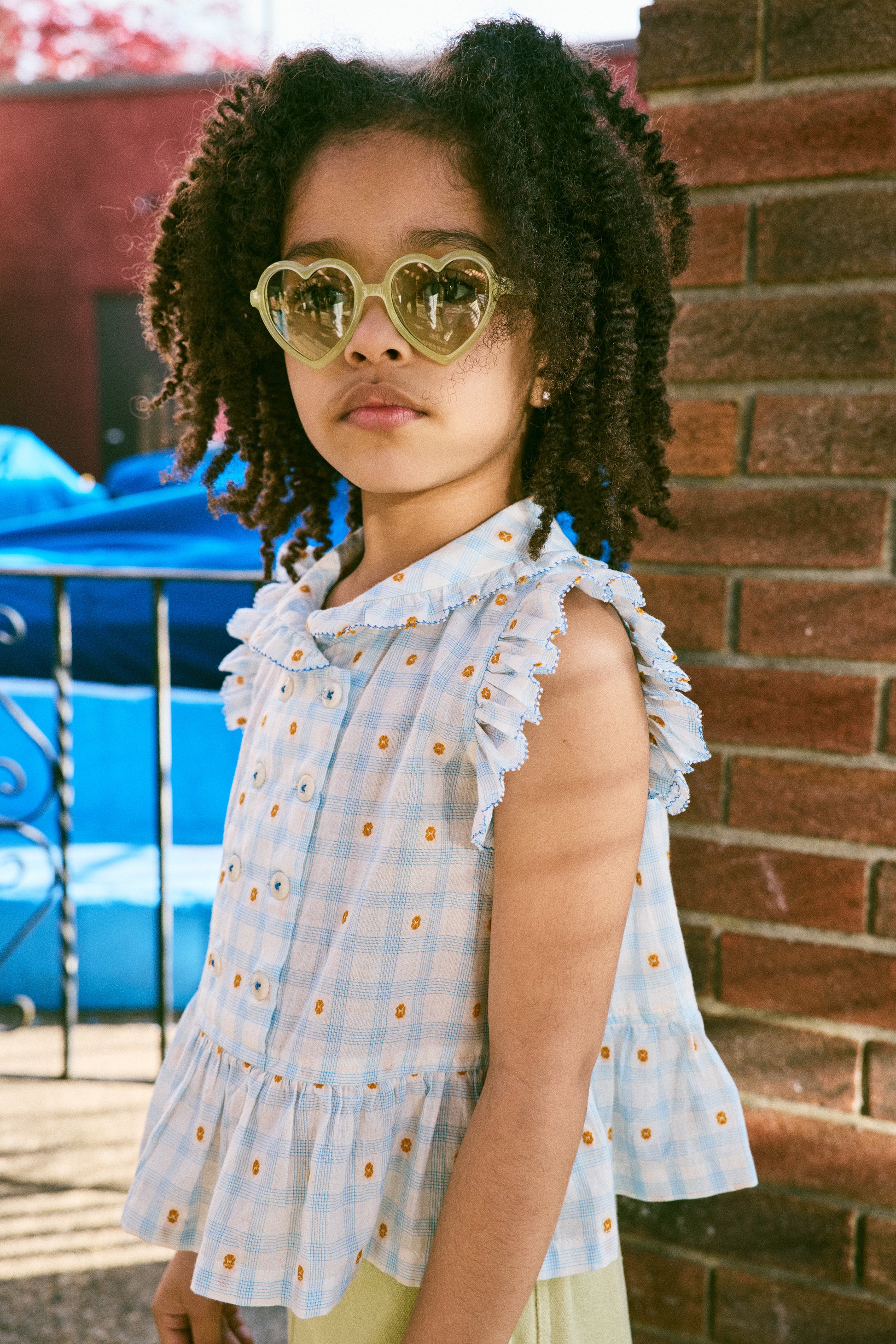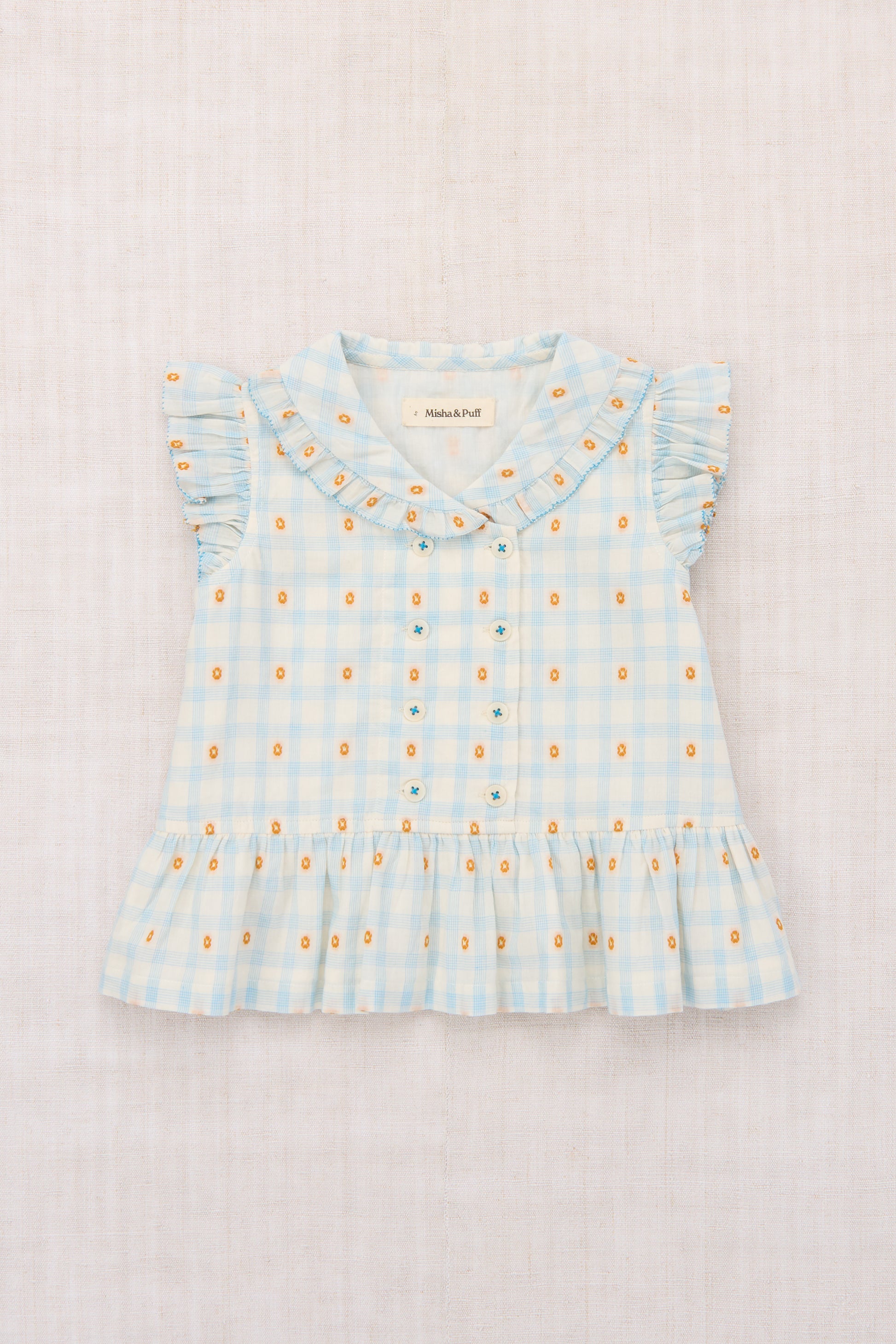 A sleeveless peplum top in lightweight organic cotton plaid, with a woven textured design, rounded collar, ruffle trim with edge detail, and a double-breasted corozo button closure. Lined in cotton voile and finished with French seams.