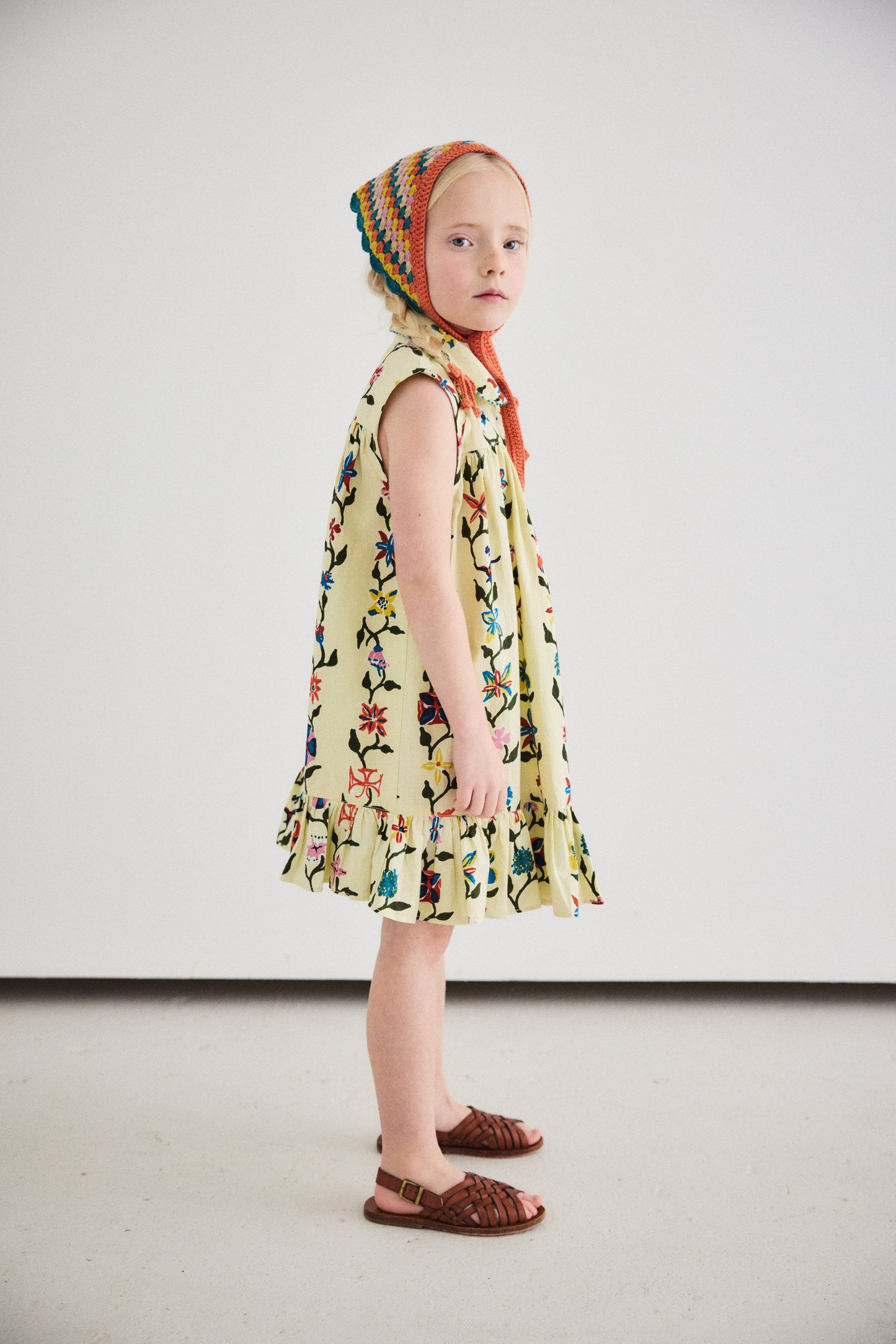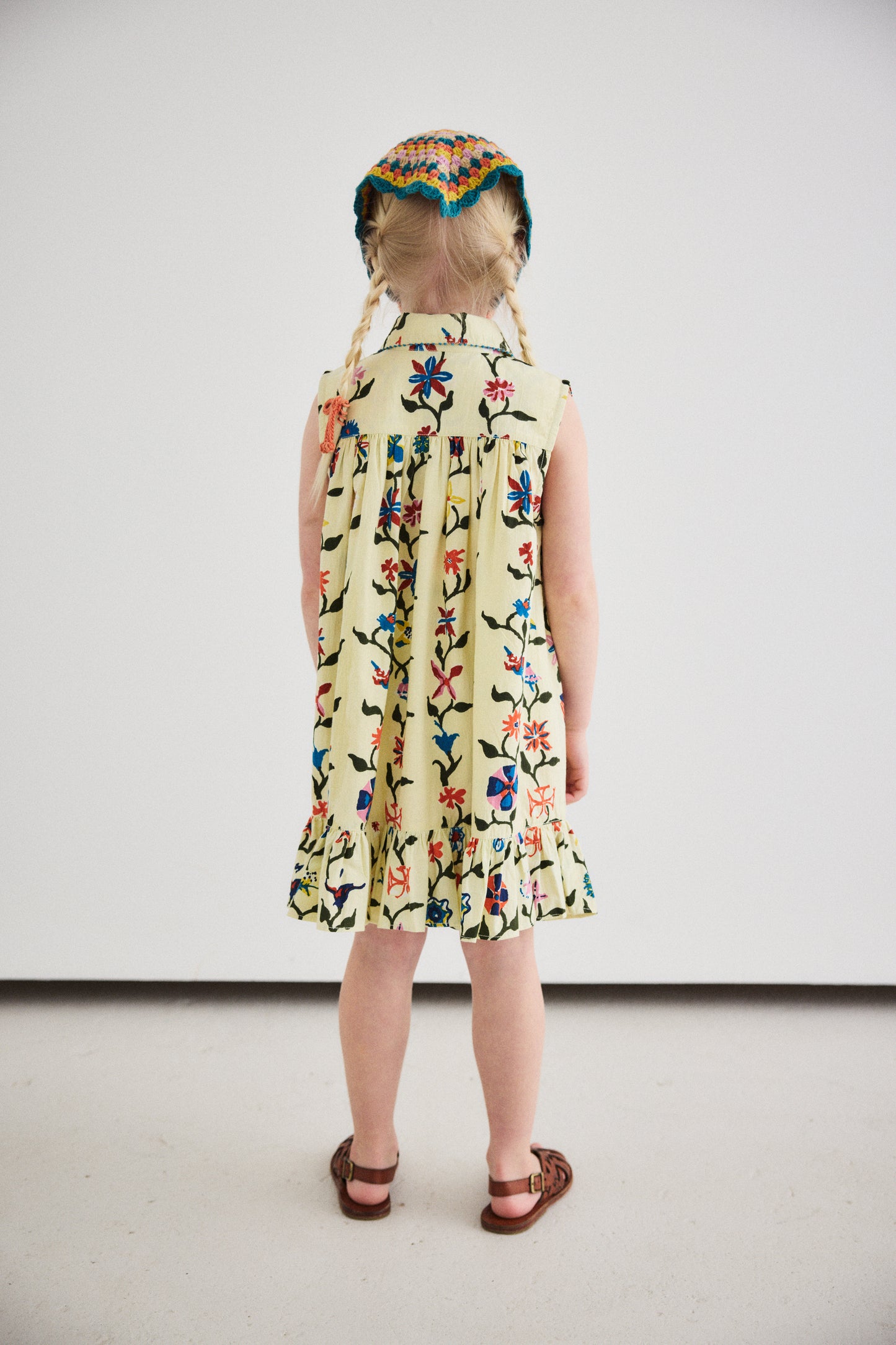 A sleeveless dress in cotton poplin, featuring a gathered yoke, rounded collar, ruffled hem, corozo button closure, and dotted trim detail. Finished with French seams.