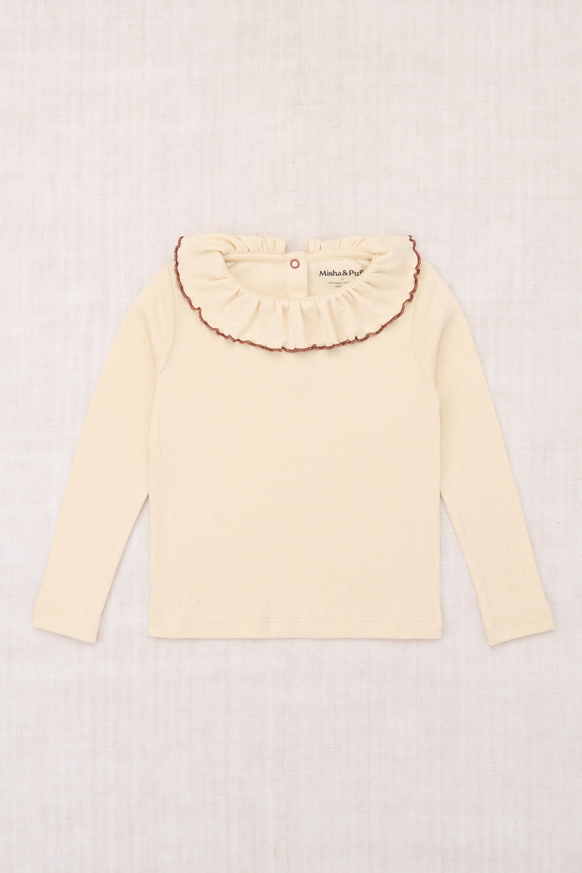 A long-sleeved slim-fit top in soft organic Pima cotton, featuring a delicate pointelle pattern, a gathered ruffle neck with contrast merrowed edge and snap closure at the back neck.