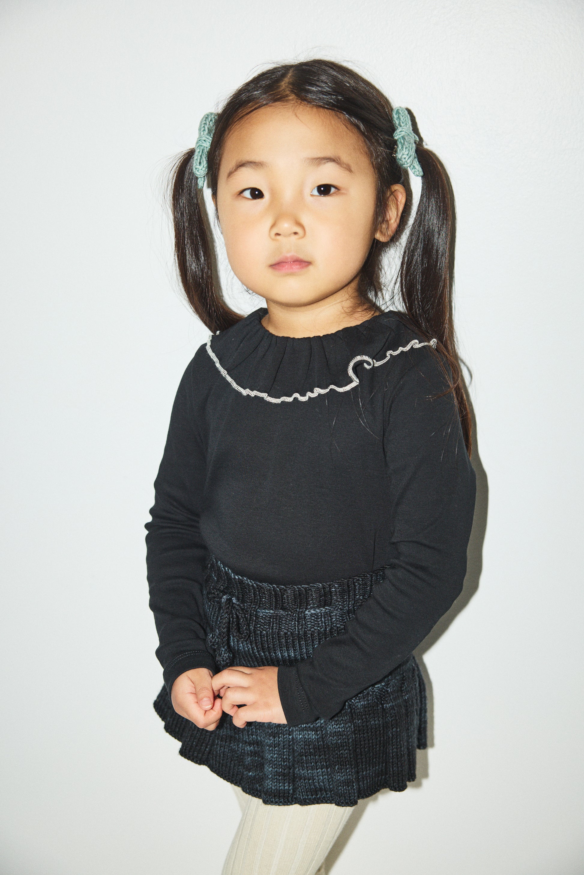 A long-sleeved slim-fit top in soft organic Pima cotton, featuring a gathered ruffle neck with contrast merrowed edge and snap closure at the back neck.