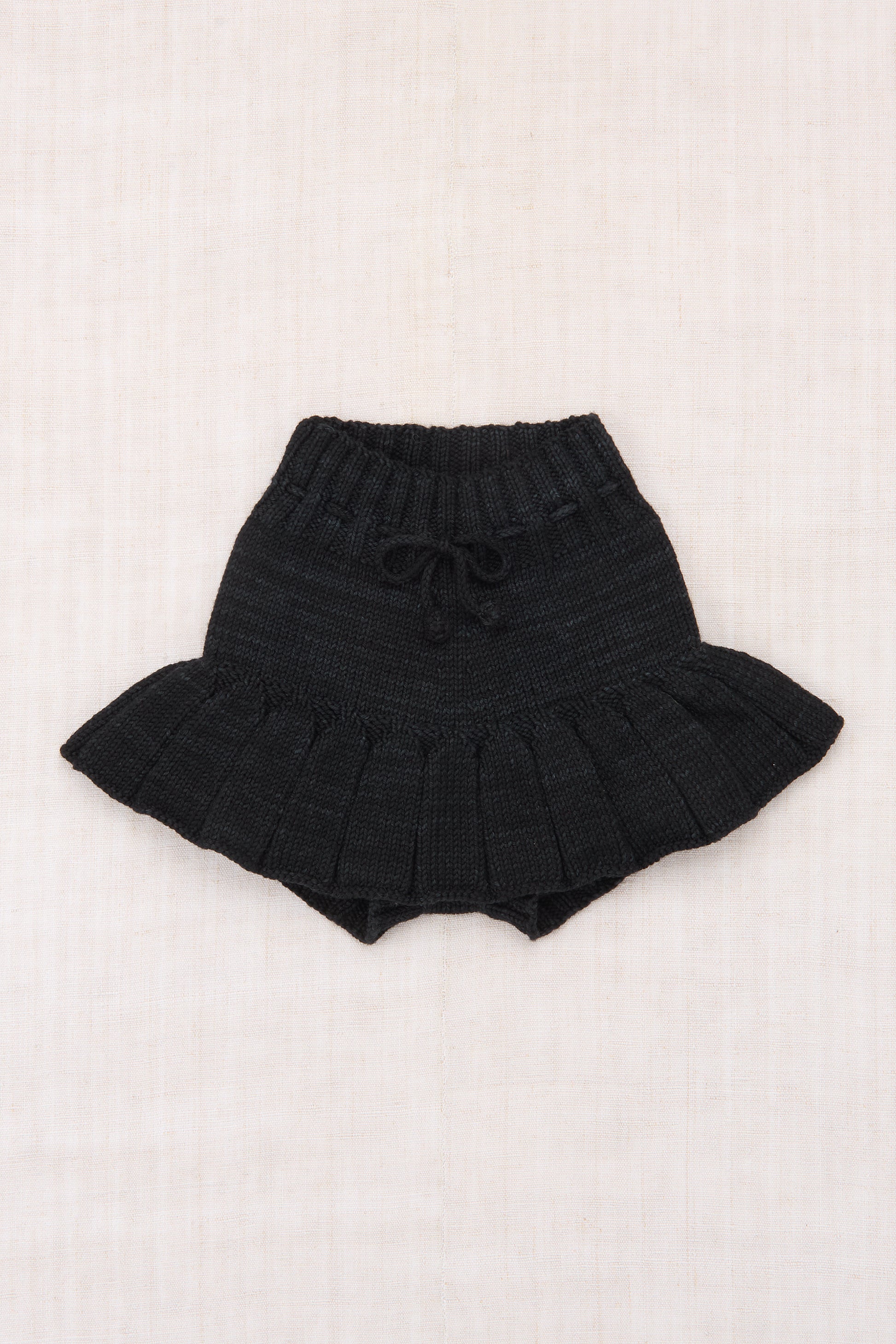 A hand-knit skirt in Merino wool, featuring attached bloomers with ribbed cuffs and a ribbed waistband with a popcorn tie drawstring for a secure fit.