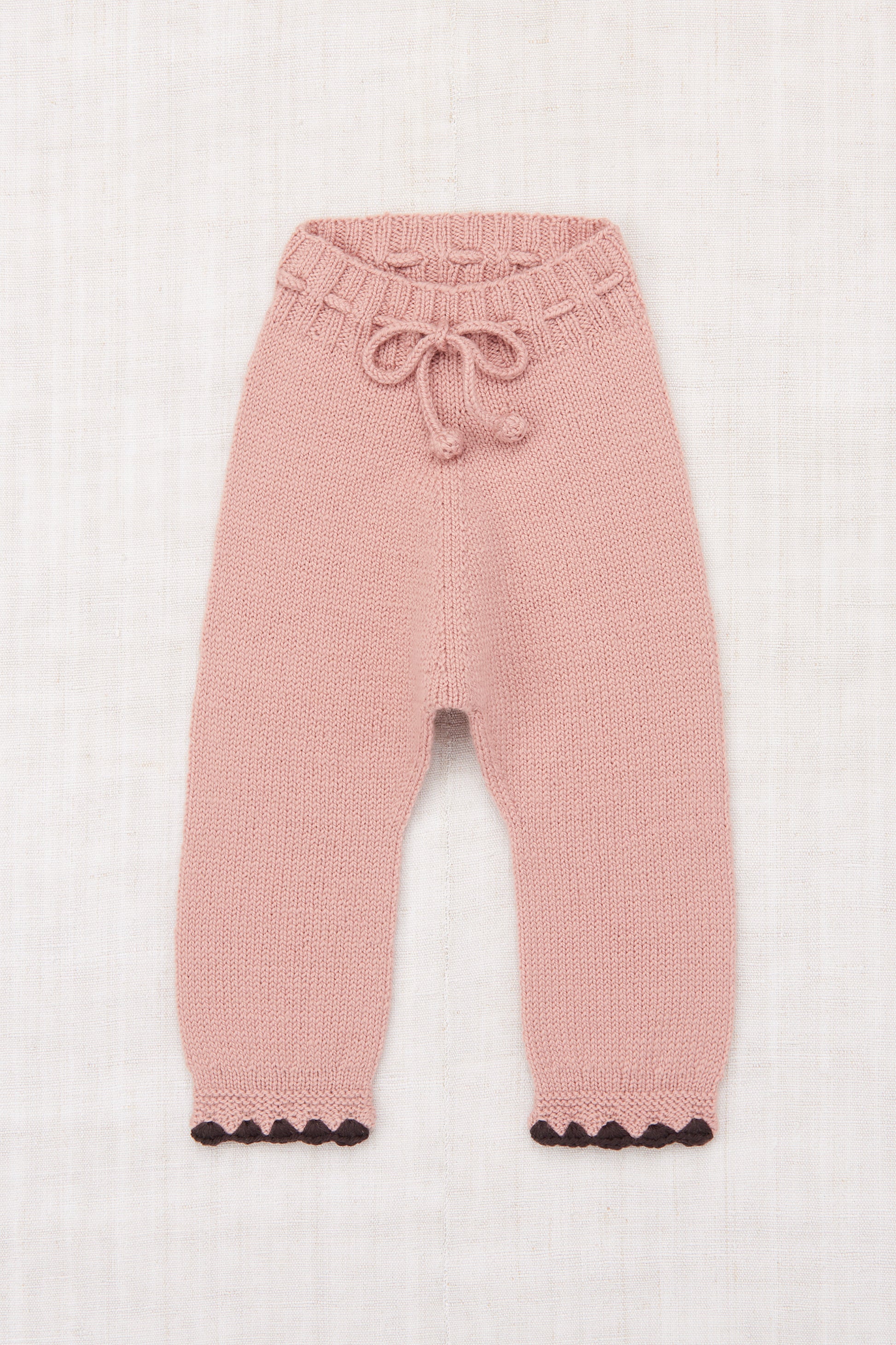 A hand-knit cozy jogger-style legging in Merino wool, featuring hand-crocheted trim detail and a ribbed waistband with a popcorn tie drawstring for a secure fit.