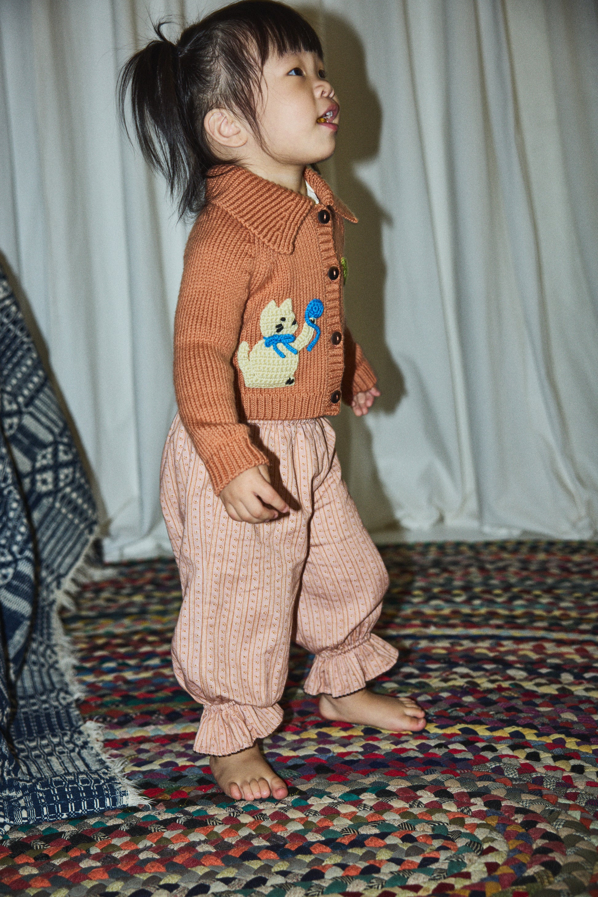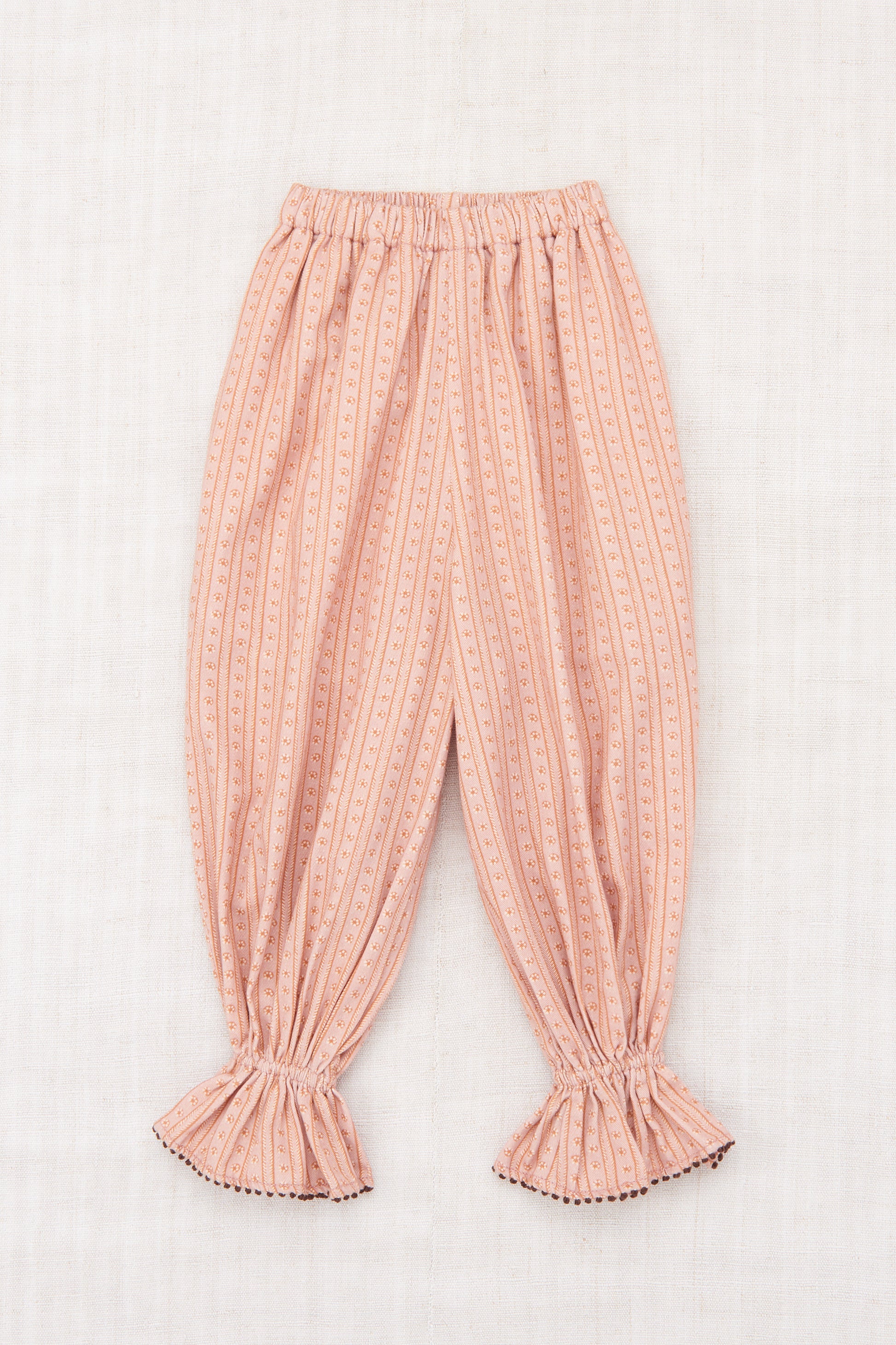 A statement-making pull-on pant in cotton twill, featuring a gathered elastic waistband and a ruffled hem with embroidered dot-stitch detailing, adding a touch of flair. Finished with French seams.