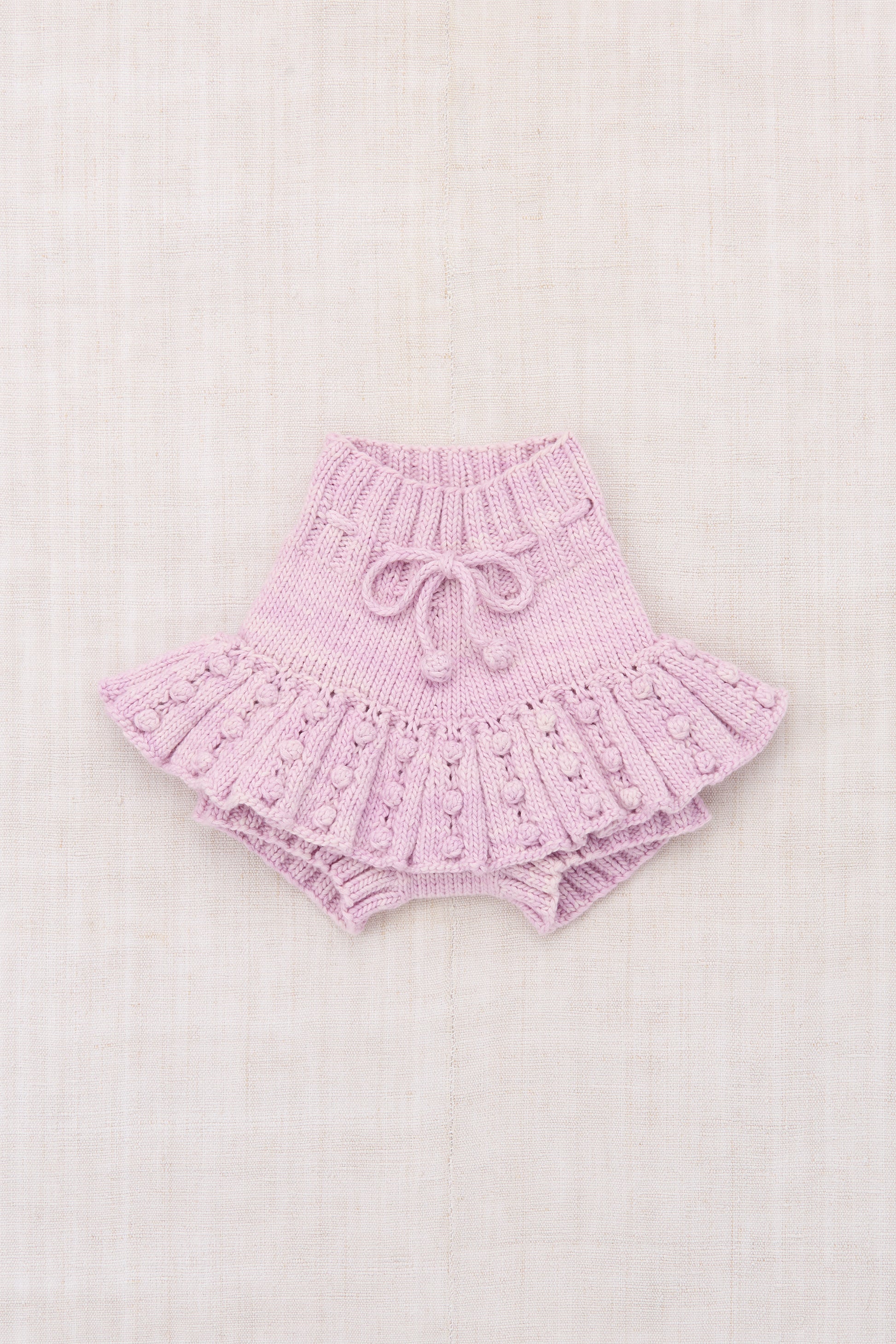 A hand-knit skirt in Pima cotton, featuring attached bloomers with ribbed cuffs, eyelet popcorn stitch details, and a ribbed waistband with a popcorn-tie drawstring for a secure fit.