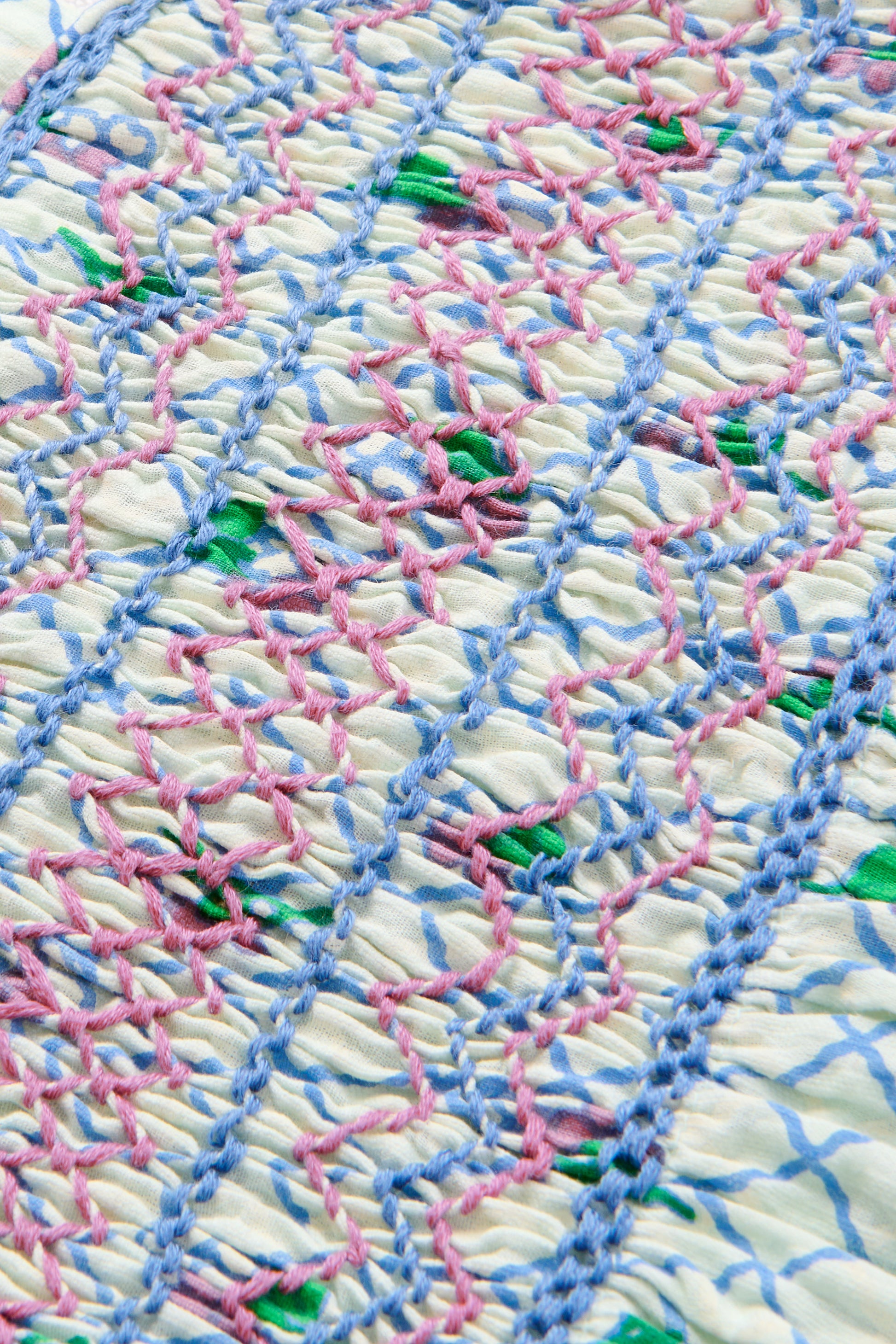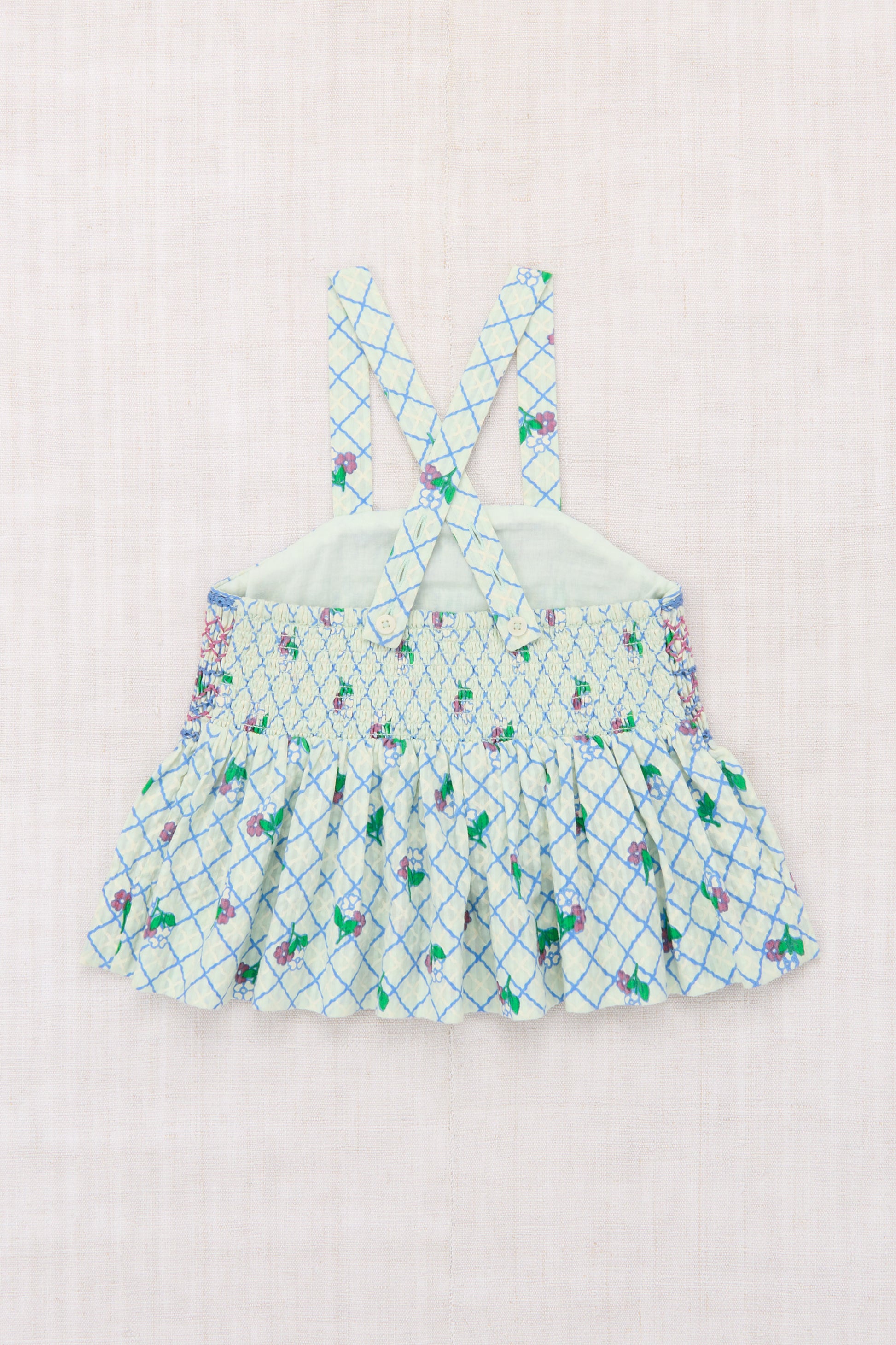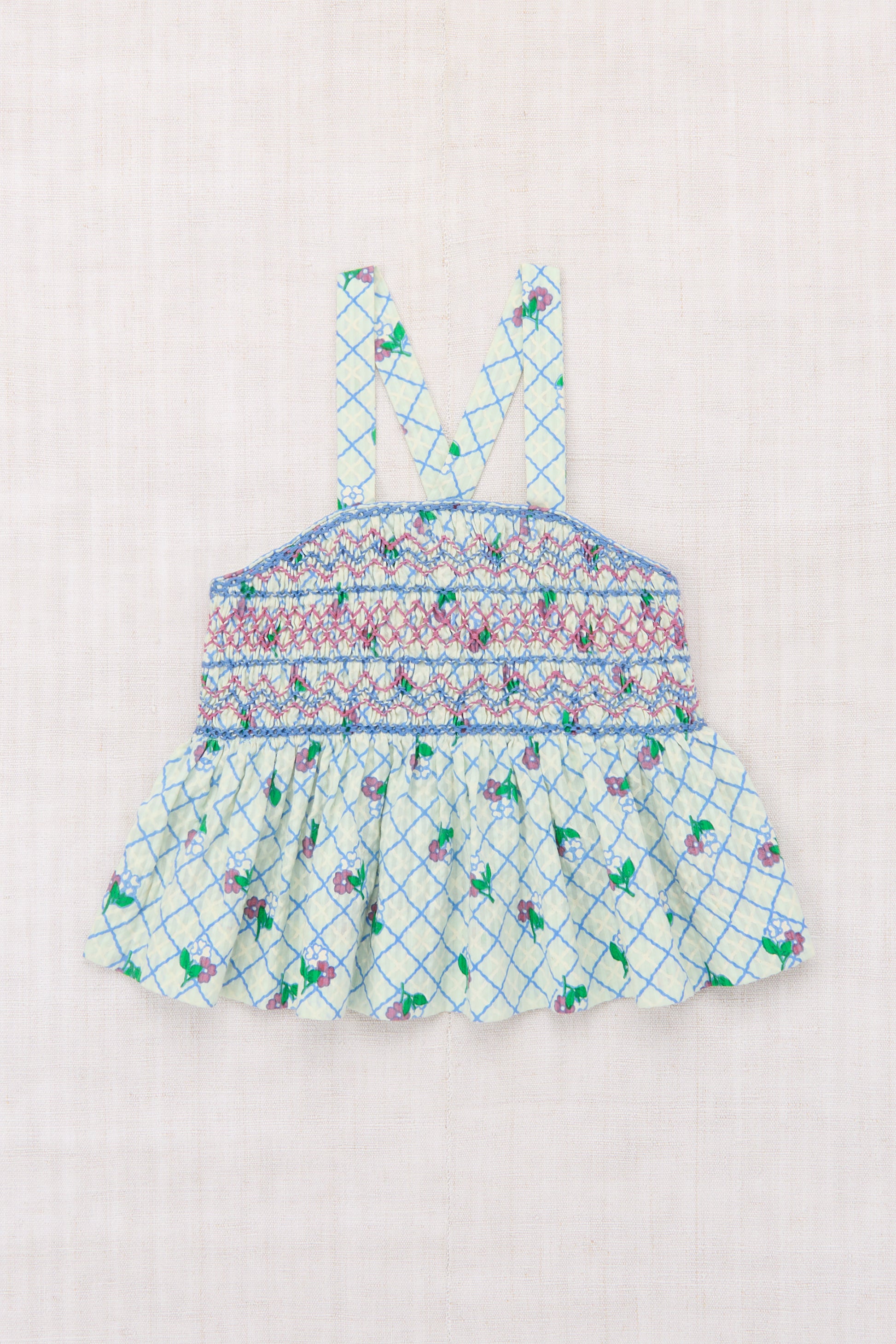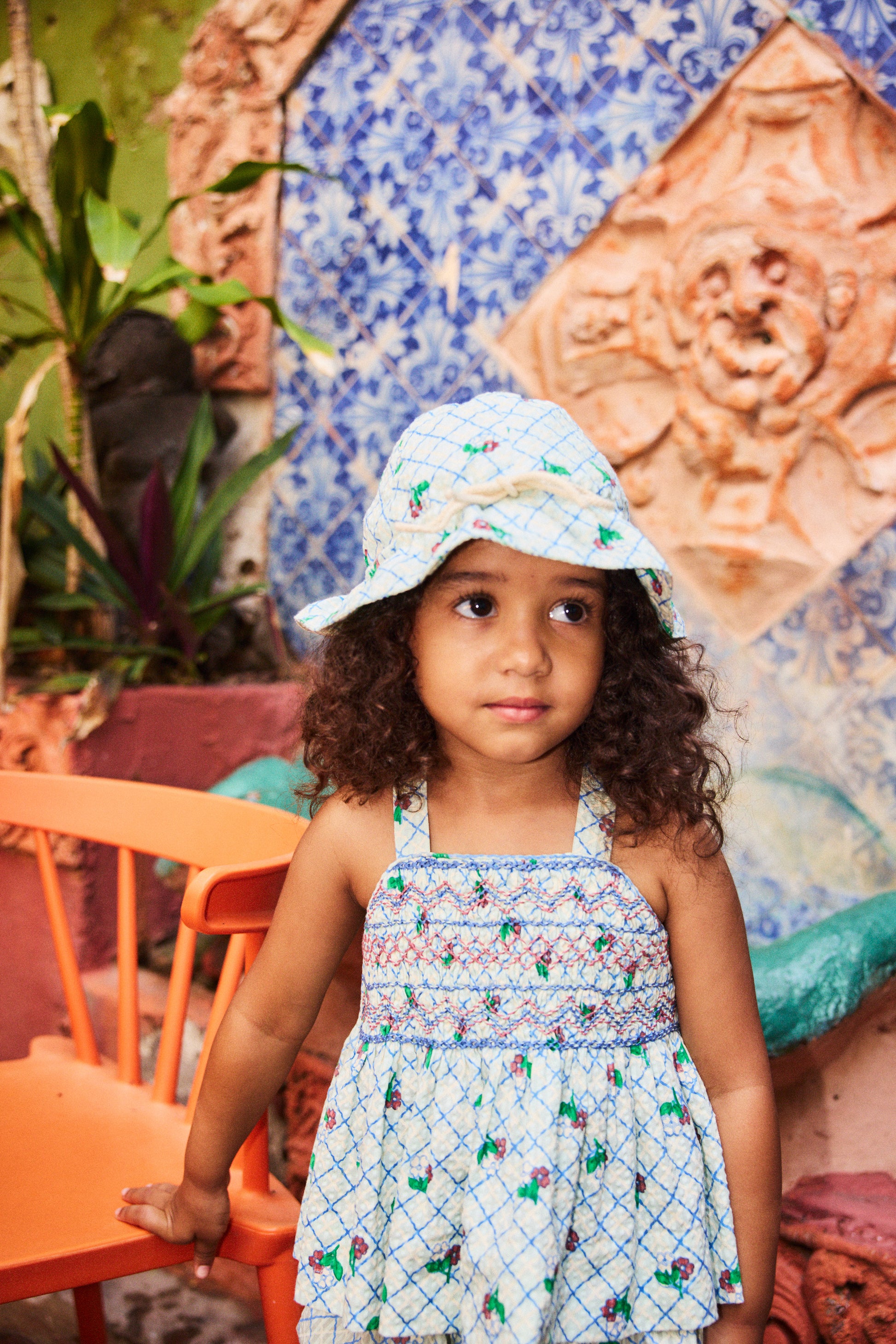 A peplum-style tank top in lightweight organic cotton seersucker, with a multi-color hand-smocked bib, a square neckline, and adjustable straps with corozo button closure. Fully lined in cotton voile, and finished with French seams — an effortless texture, easily packable for travel. Featuring a print inspired by seaside family vacations.