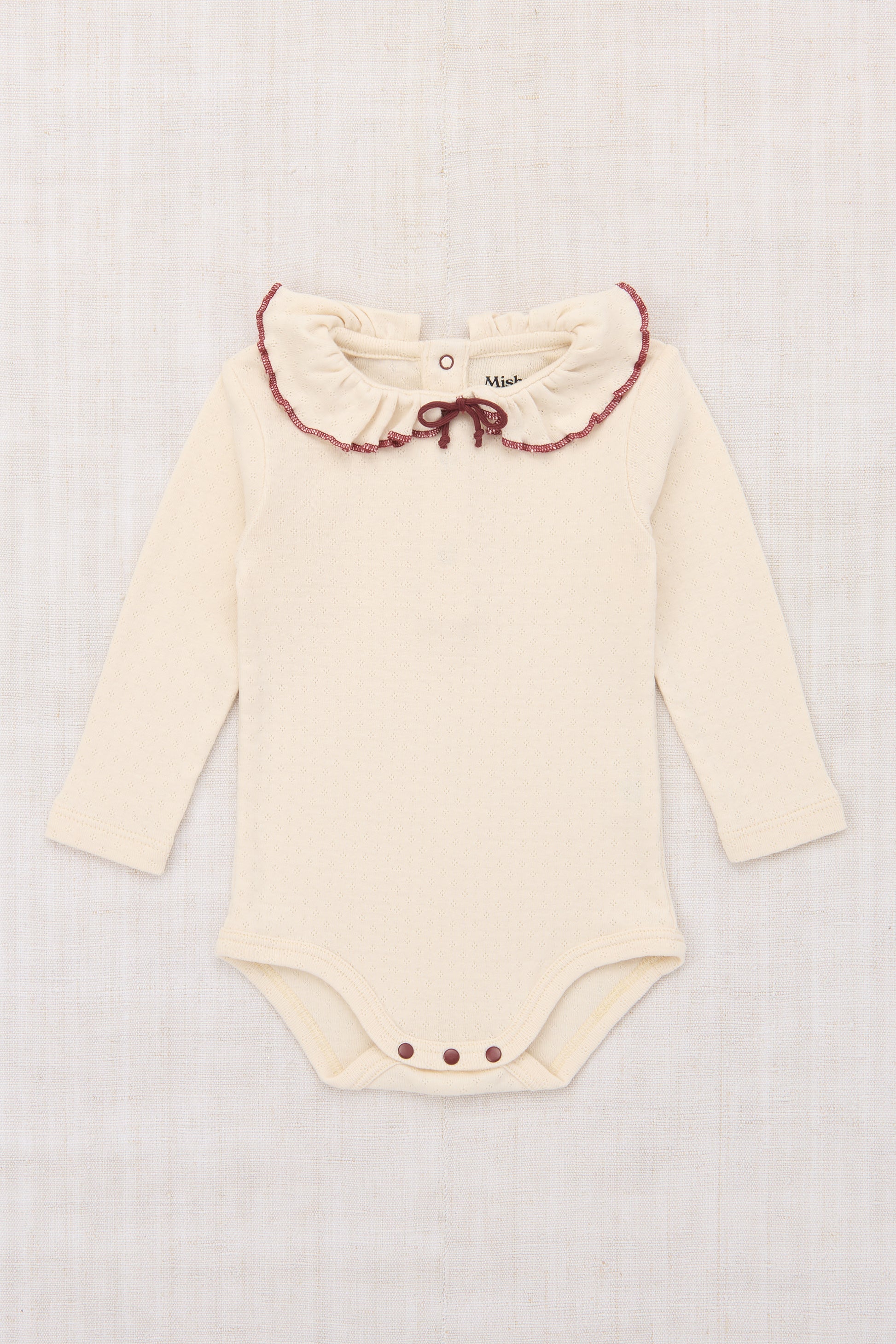 A long-sleeved onesie in organic Pima cotton, featuring a delicate pointelle pattern, ruffle collar with a contrast merrowed edge and mini bow. Finished with snap closure at the bottom and back neck — perfect on its own or layered for a versatile, buildable look.