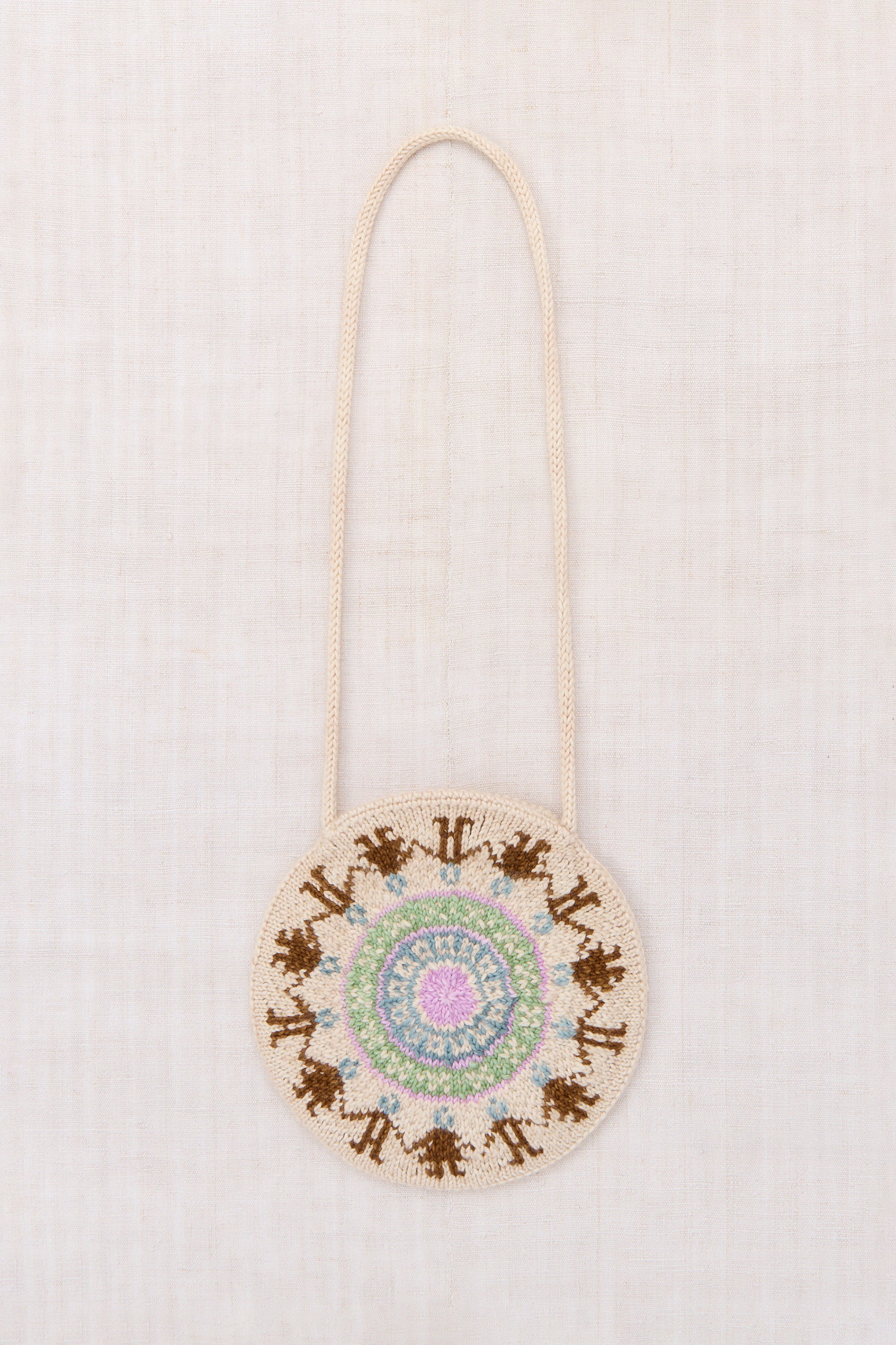 A hand-knit bag in Merino wool, featuring a Fair Isle-inspired motif, and a magnetic snap closure.