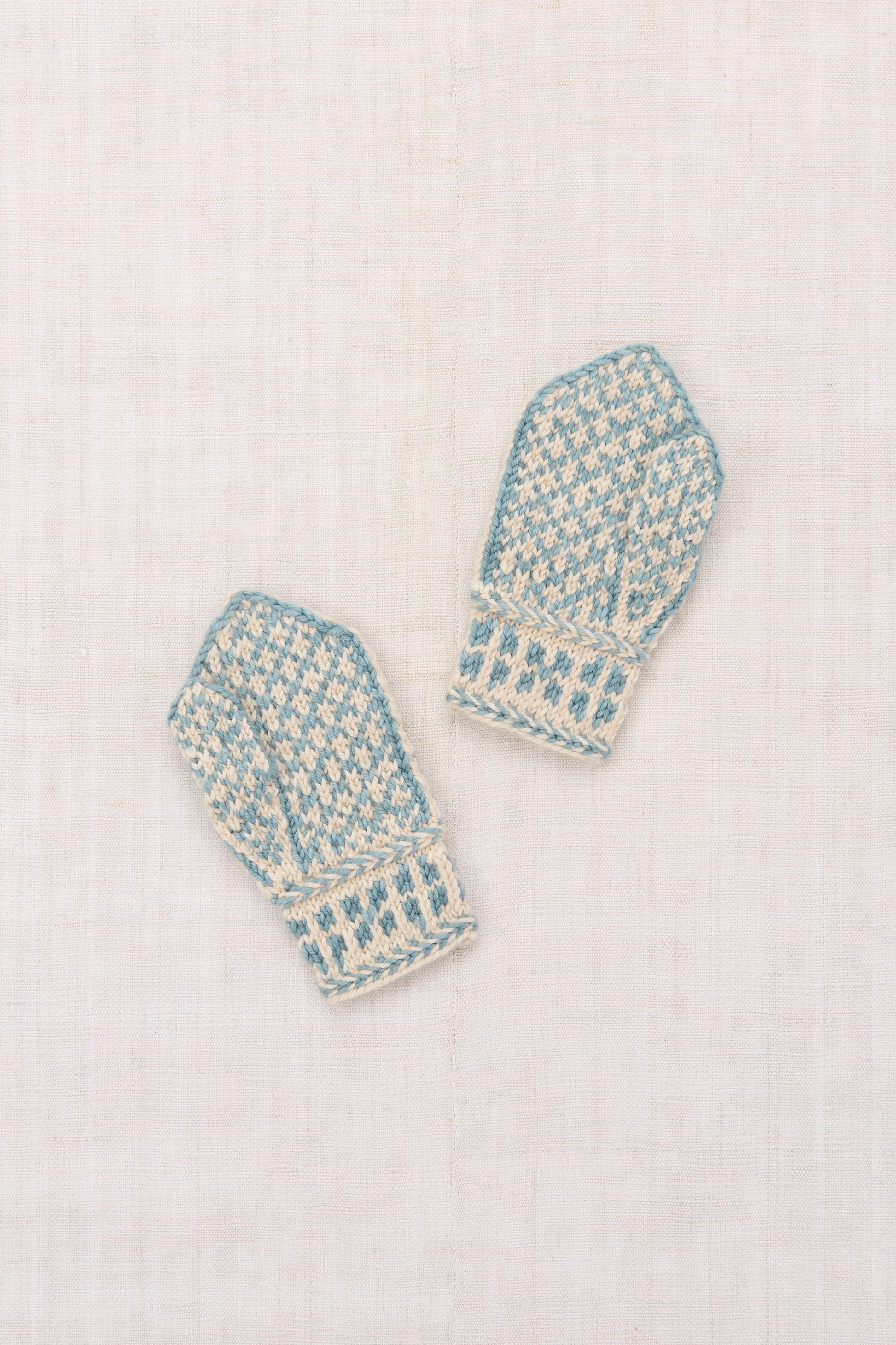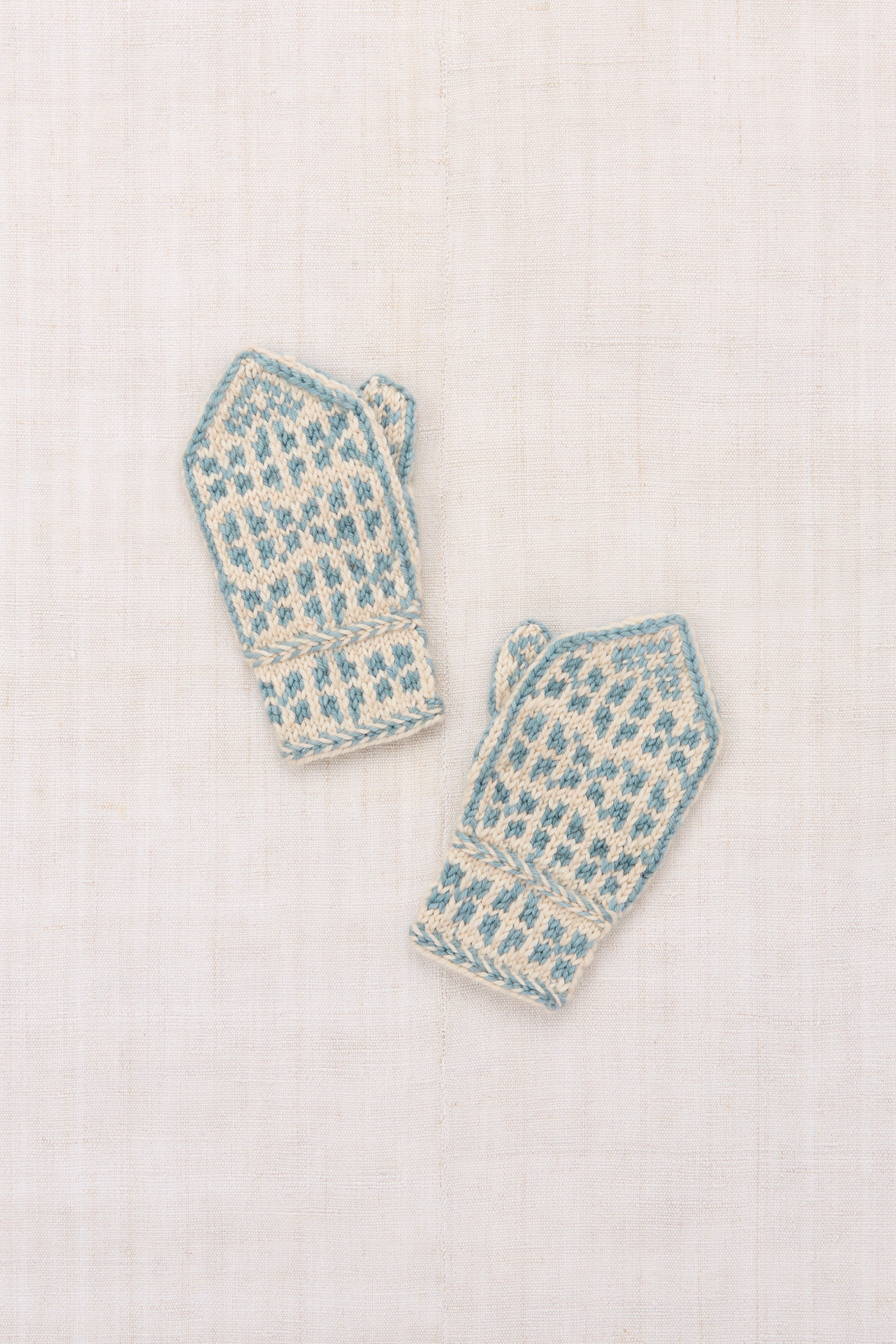 A hand-knit pair of mittens in Merino wool, featuring a vintage-inspired pointed shape, Fair Isle colorwork motifs, and raised braided trim.